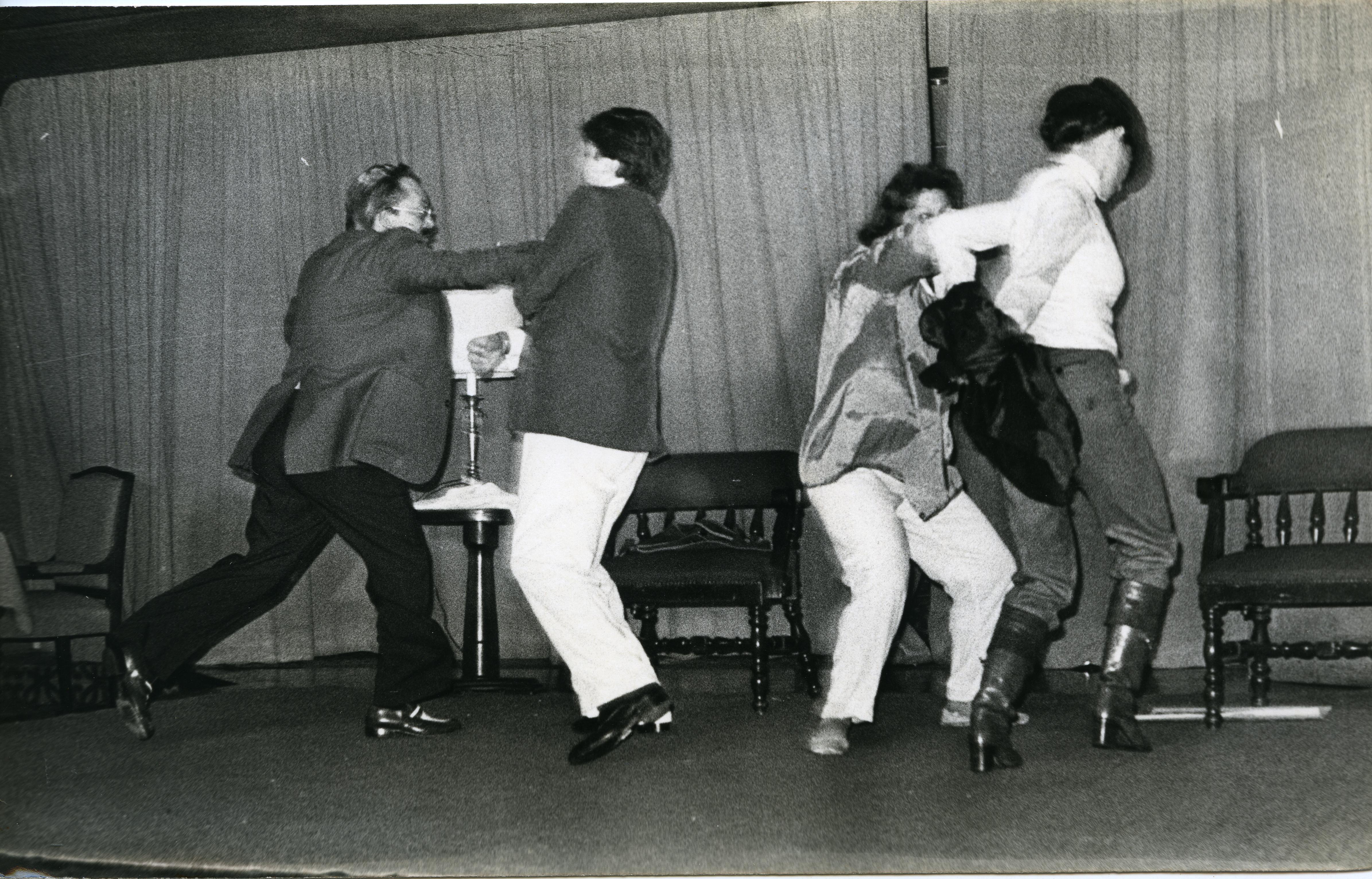 En la gráfica se observa una puesta en escena de la obra teatral, presentada por el Teatro Experimental de Cali, "Liberación Masculina". Se observan cuatro personas peleando físicamente entre sí.