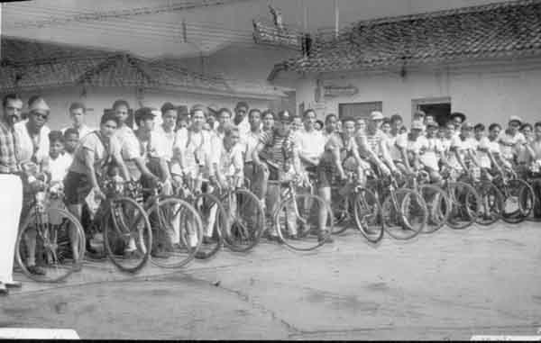 Competencia ciclística en el barrio San Nicolás. Entre los ciclistas se encuentra Argemiro Sánchez. Santiago de Cali, 1949.