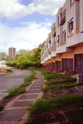 Plano medio. En la parte derecha de la fotografía observamos edificaciones abandonadas con algunos vidrios rotos, un pequeño caminoque va hacia una curva. Se observan algunos edificios en la lejanía.