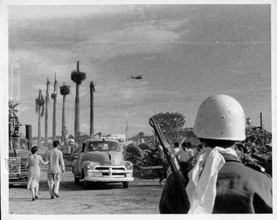 Avenida Miguel López Muñoz (Hoy calle 25); en lo alto se observa el avión Hércules trayendo víveres y ayudas para los damnificados de la explosión del 7 de agosto