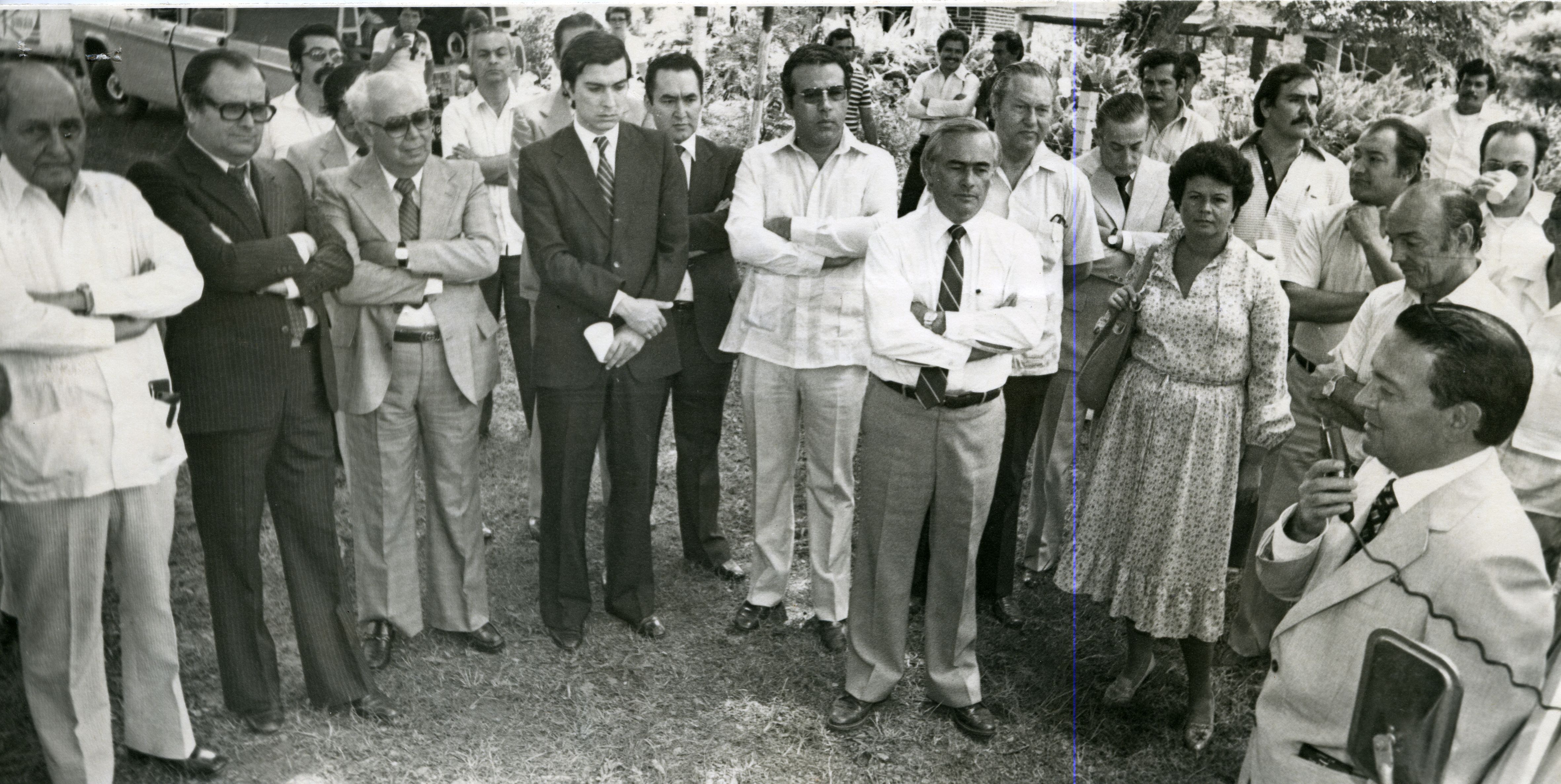 Fotografía de plano medio largo de Humberto González Narváez, donde se ve hablando por un micrófono, al rededor de él se puede observar a varias personas que lo acompañan, junto a él se destaca la presencia de una mujer