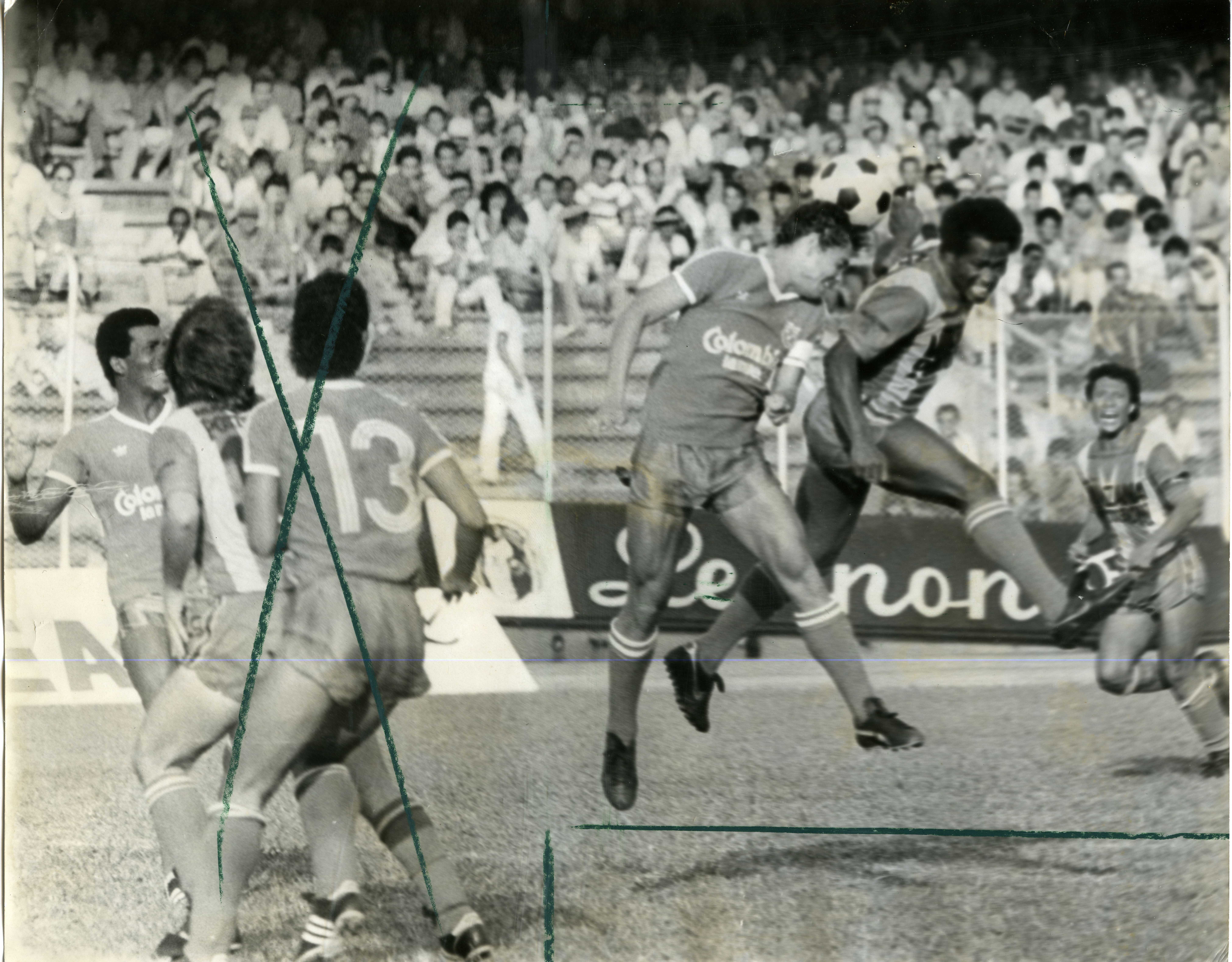 Partido entre los equipos América de Cali vs Pereira, realizado en el estadio Pascual Guerrero. Se aprecia jugadores disputan balón por lo alto