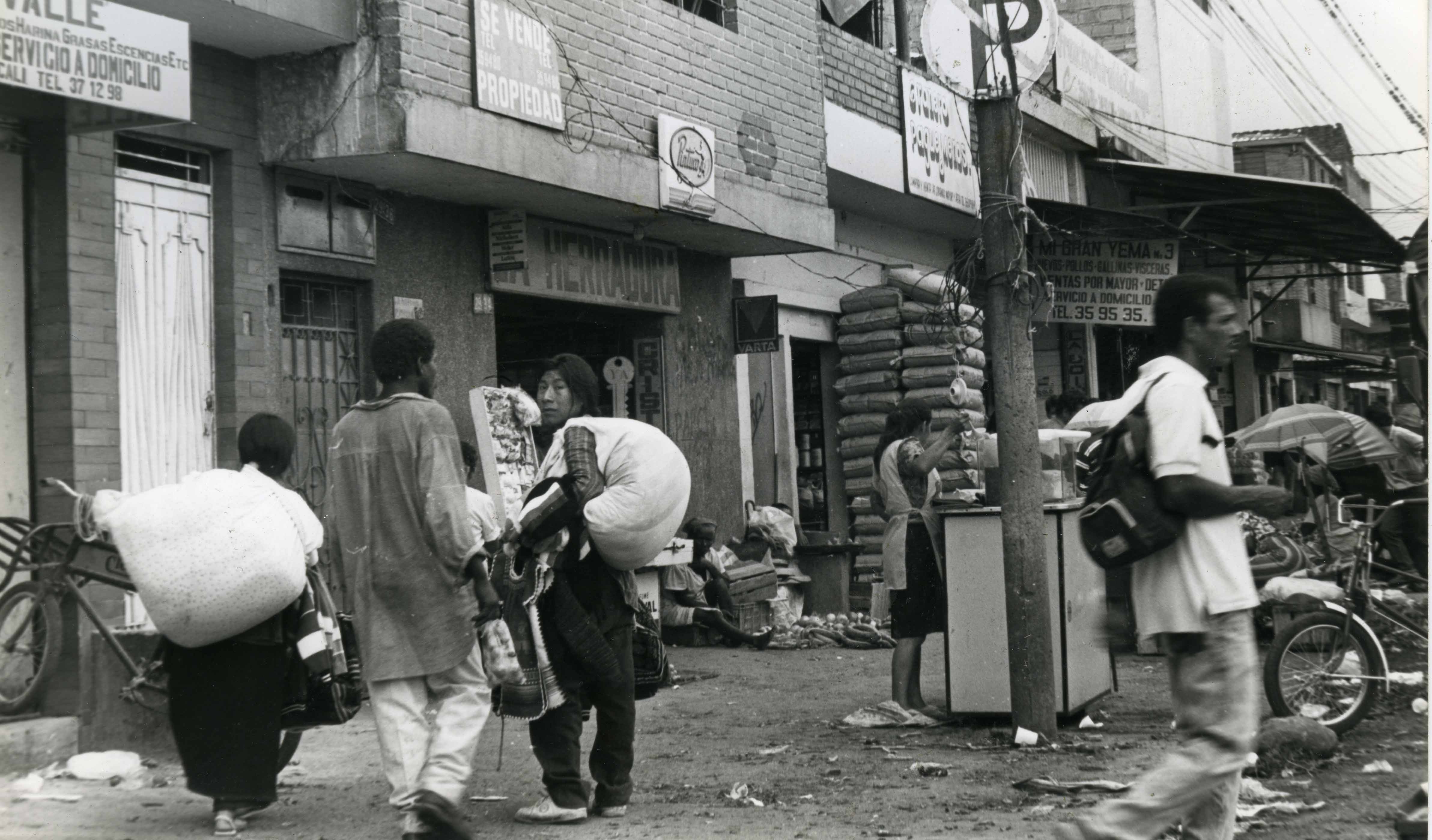 En el pie de foto dice lo siguiente: Las casas para vivienda han desaparecido en los sectores donde funcionaban las plazas de mercado. Por la proliferación de negocios en sus alrededores los dueños se han visto obligados a cambiar la destinación de sus antiguas residencias o venderlas, acabándose así la vida familiar en algunos barrios de Cali. A la falta de reglamentación sobre el funcionamiento de negocios se suma el estado de abandono de las edificaciones y la falta de aseo en las vías públicas.- El Archivo del Patrimonio Fotográfico y Fílmico del Valle del Cauca es responsabilidad de la Biblioteca Departamental del Valle Jorge Garcés Borrero, por convenio de cooperación suscrito con la Secretaria del Cultura Departamental, con el fin de aunar esfuerzos para su conservación, preservación y divulgación del Archivo entre la comunidad Vallecaucana, especialmente entre los estudiantes e investigadores que visitan la Biblioteca, propiciando el su uso y consulta permanente. La universidad Icesi es un colaborador en el proceso de difusión, facilitando la tecnología que permite la consulta de las imágenes.