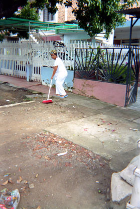 Plano contexto. Exterior día. Mujer barriendo. Sobredimensión de contexto, respecto a sujeto. Superficie de suelo con presencia de elementos irregulares. Casas de fondo.