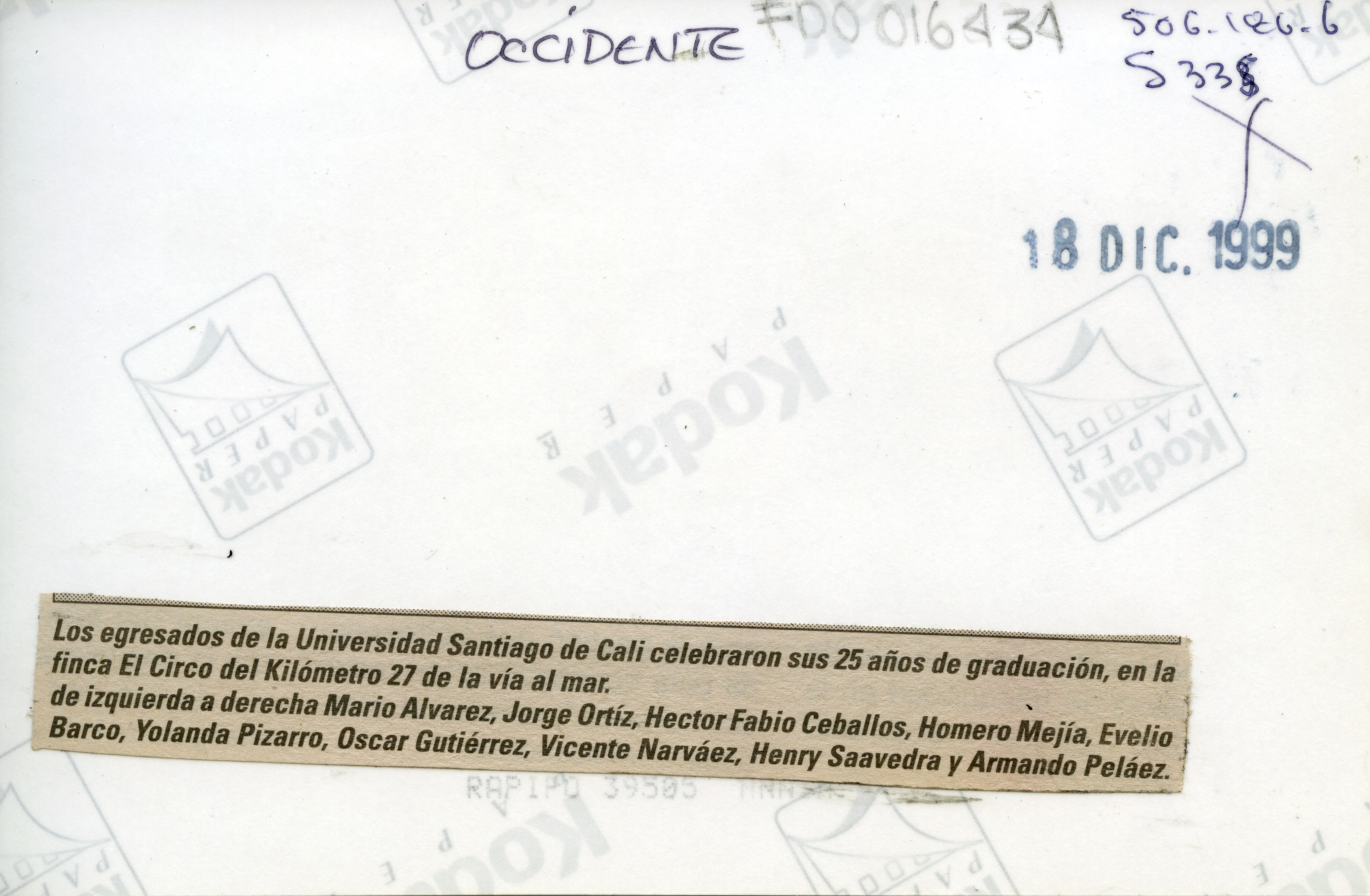 Al reverso de la fotografía se anexa recorte: "Los egresados de la Universidad Santiago de Cali celebraron su 25 años de graduación, en la finca El Circo del Kilometro 27 de la vía al mar. De izquierda a derecha Mario Alvarez, Jorge Ortíz, Héctor Fabio Ceballos, Homero Mejía, Evelio Barco, Yolanda Pizarro, Oscar Gutiérrez, Vicente Narváez, Henry Saavedra y Armando Peláez."