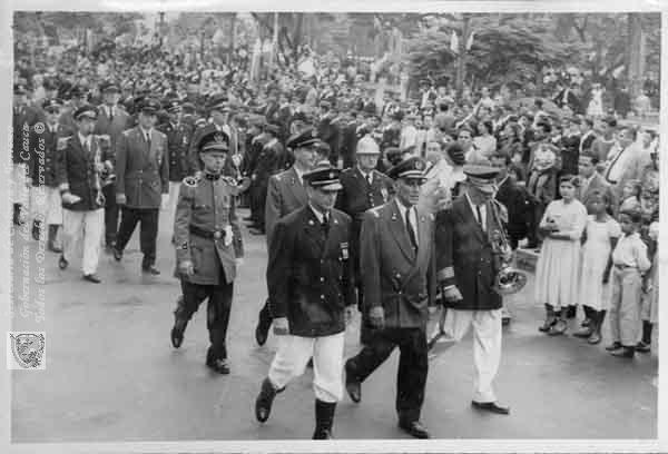 Celebración de los 25 años del Cuerpo de Bomberos. Desfile por la carrera primera frente al Parque Uribe. Primera fila, izquierda Comandante Araujo de Panamá, Comandante Francisco Magaña (centro) y Aurelio Carrera Calvo tocando la bocina de mando, símbolo de oficial. Segunda Fila, a la derecha Max Viver Comandante de la Estación Lafrance de Lima Perú. tercera fila, izquerda Comandante de Venezuela. Cali. C. 1953.