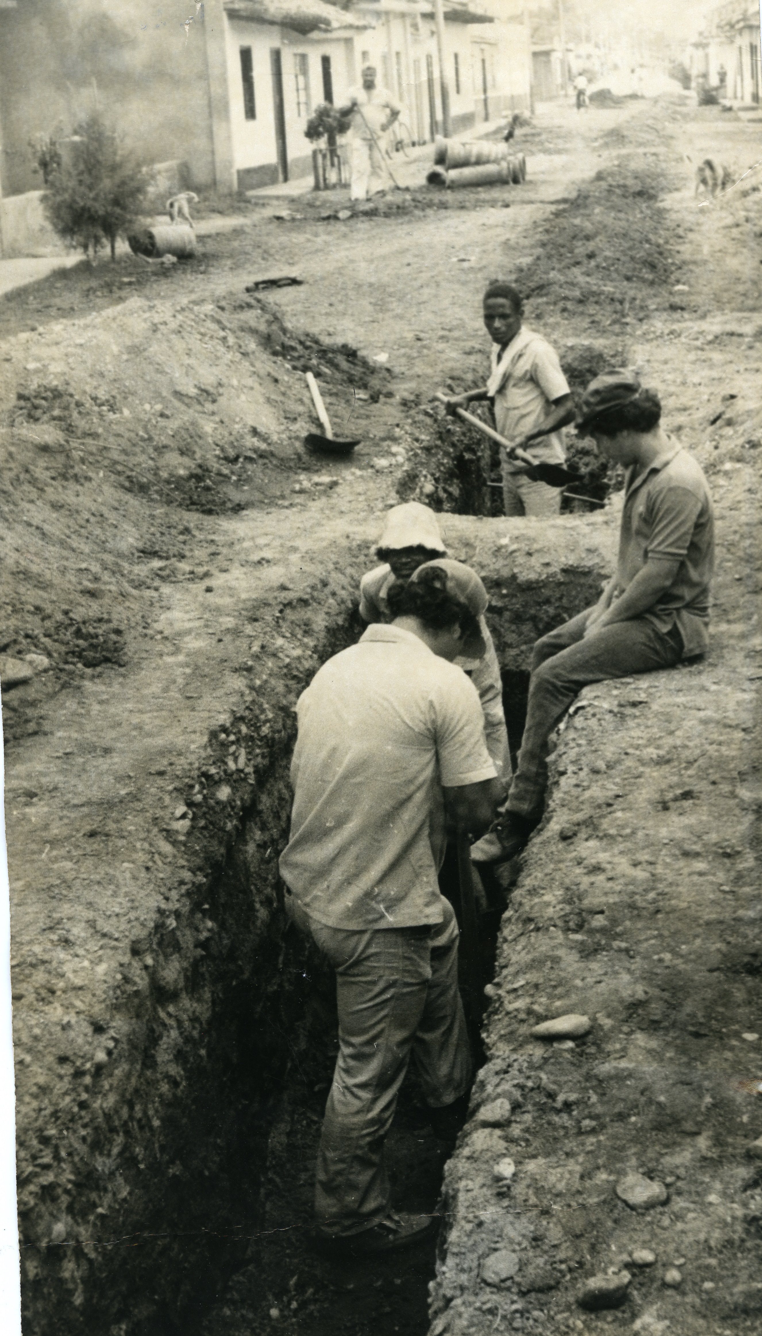 Alcantarillado para el bario San Fernando. Apreciamos cuatro hombres en sus labores de la construcciòn de la red. Al reverso de la fotografía se anexa el pie de foto del periódico: "Alcantarillado. Mediante acción conjunta del municipio y de la junta de acción comunal, se trabaja en la instalación del alcantarillado en el barrio San Fernando. Ya falta un pequeño tramo para la colocación de la tuberia".