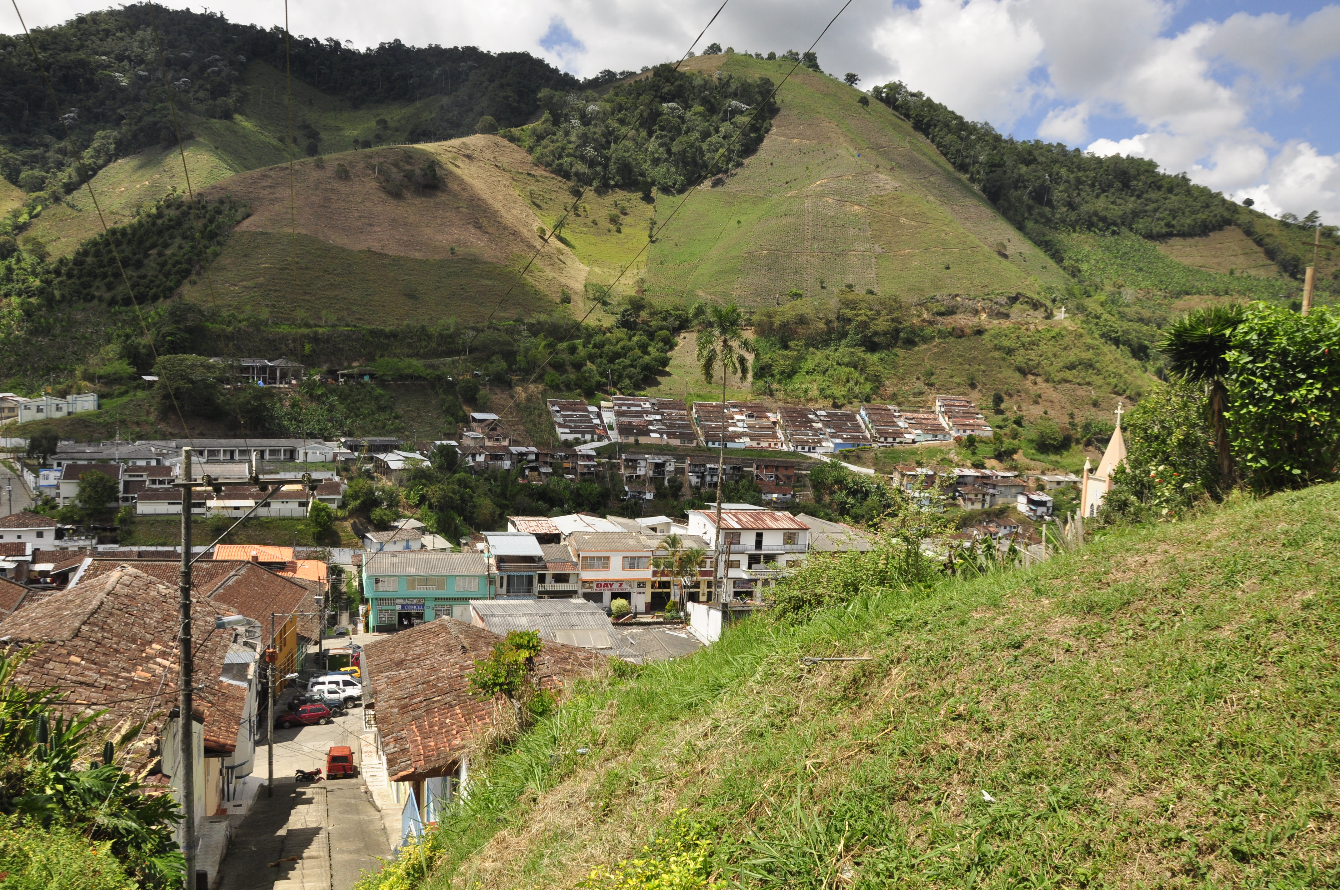 Argelia, Valle del Cauca. Fundado en 1904, por Manuel Mejía, José Antonio Murillo, Epifanio Chávez y Justiano Hincapié. Nombres: Agua Mona y después Medellíncito. Municipio desde 1956. Economía importante en agricultura, caficultura, ganadería, entre otros. Atractivo turístico: Playas del Rio Las Vueltas y sus fiestas patronales. Observamos en la imagen, hermosa vista, la montaña, y casas