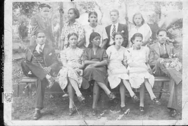 Ñato Vaca, María Domínguez, Jaime de la Cruz, Alba García, Cleila Vallecilla y David Delgado, en el parque principal. Sitio de encuentro y comunicación de la juventud bolivarense, en tardes como estas se iniciaron grandes amores. Bolívar, C.1934.