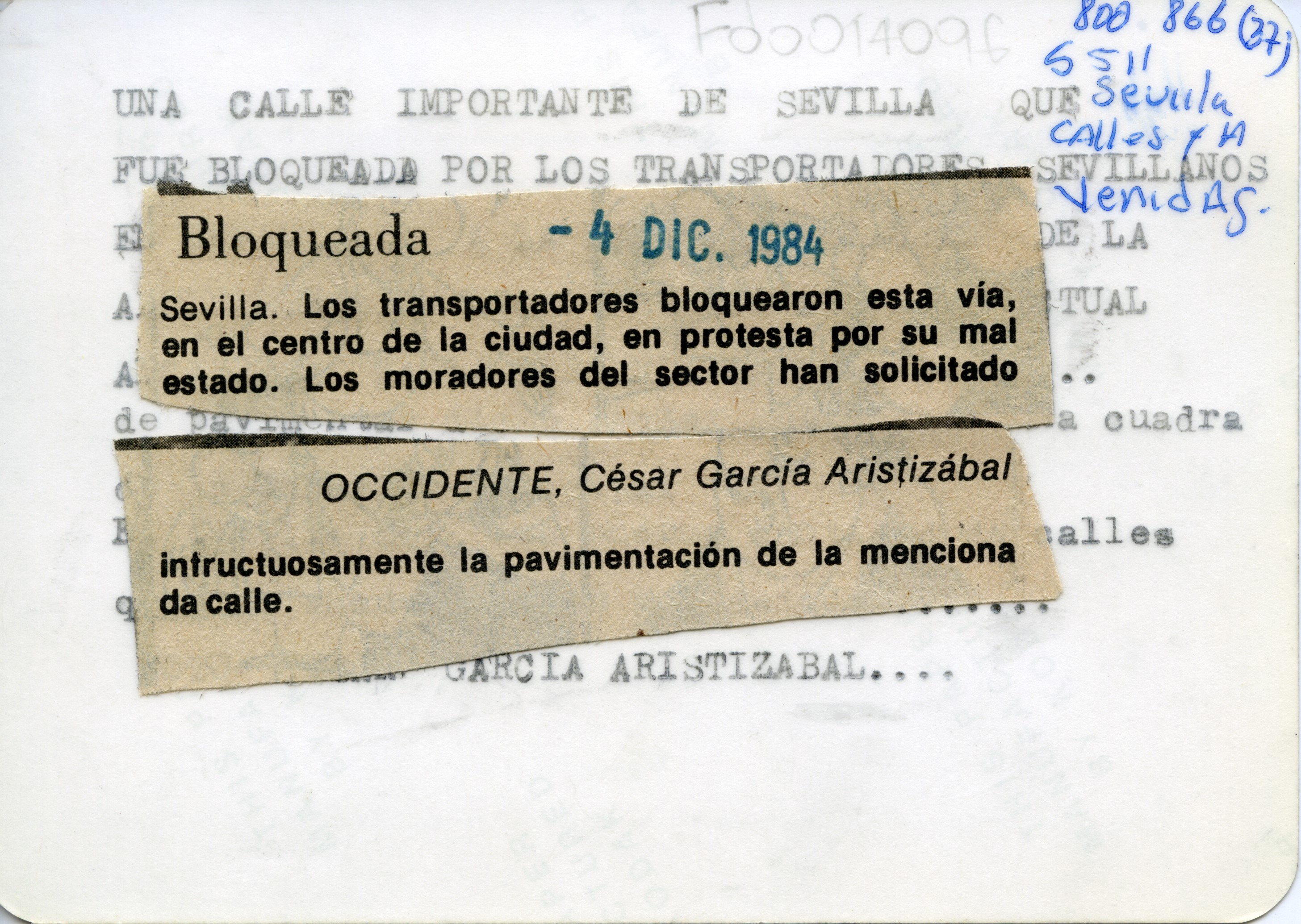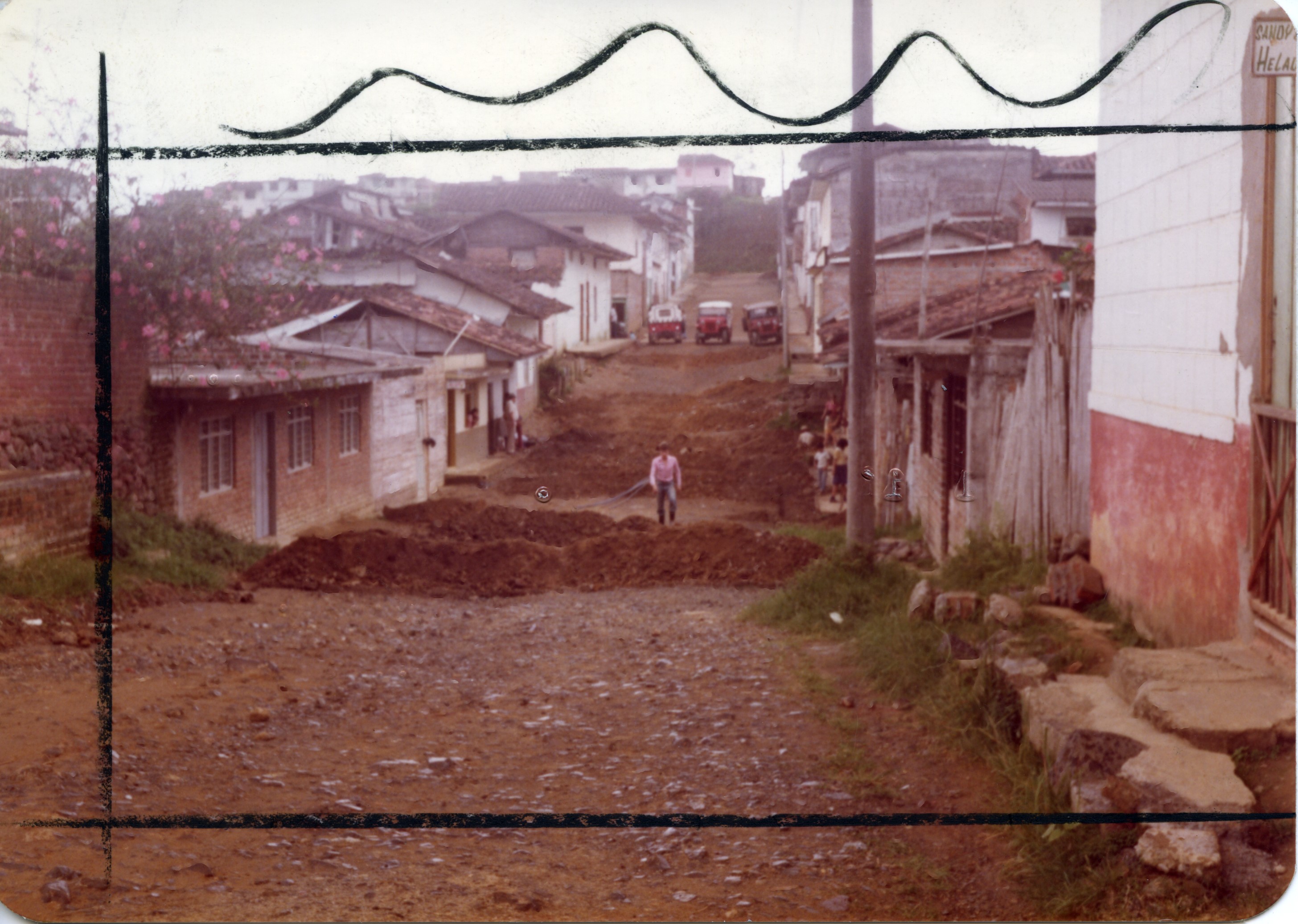 Al reverso de la gráfica se anexa el pie de foto: "Bloqueada. Los transportadores bloquearon esta vía, en el centro de la ciudad, en protesta por su mal estado. Los moradores del sector han solicitado infructuosamente la pavimentación de la mencionada calle." Se observa una calle sin pavimentar y al fondo tres vehículos jeep de color rojo con blanco parqueados e impidiendo el paso.