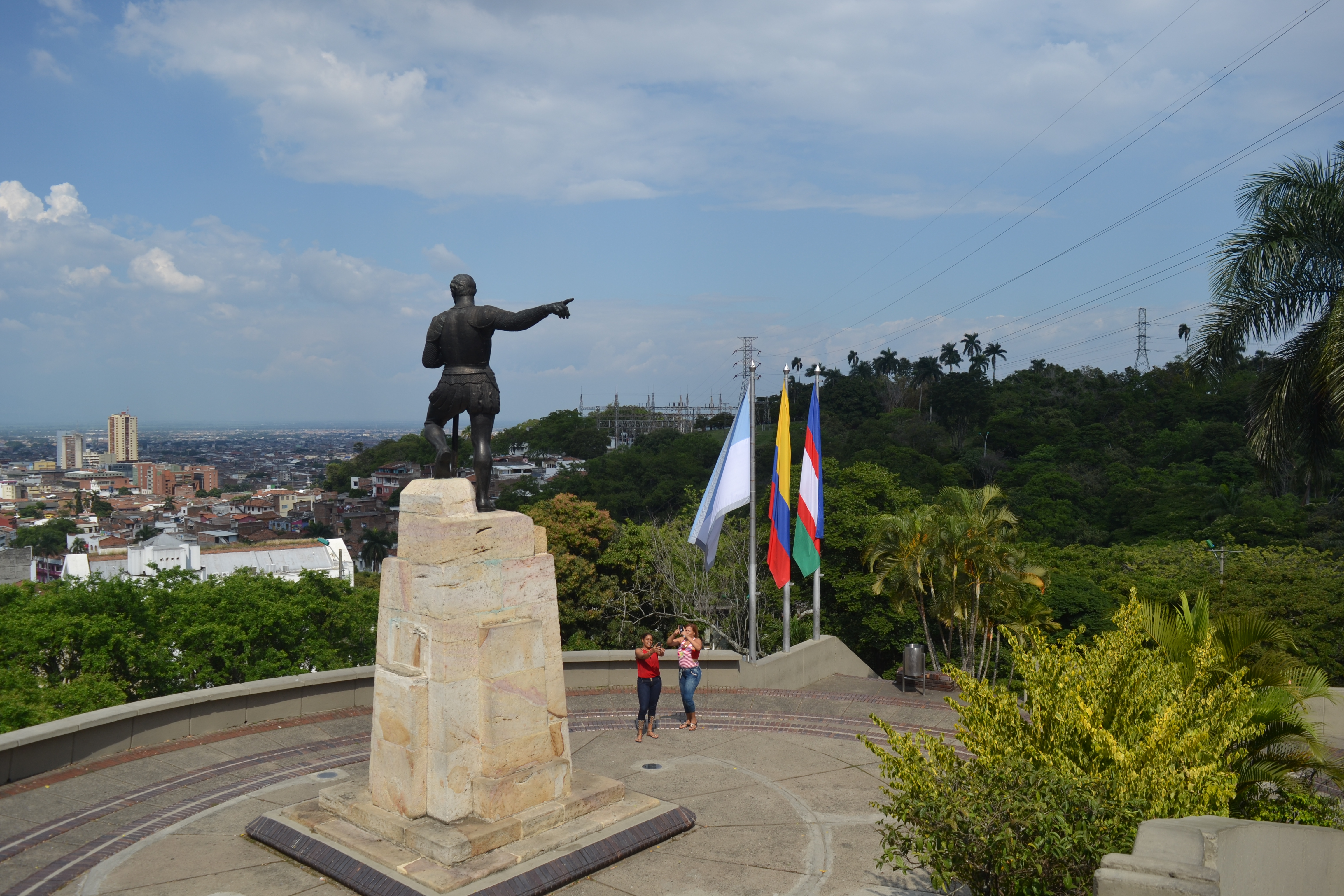 Se aprecia dos damas tomando fotografía a la estatua de Sebastián de Belalcázar, monumento caleño ubicado en el oeste de la ciudad.