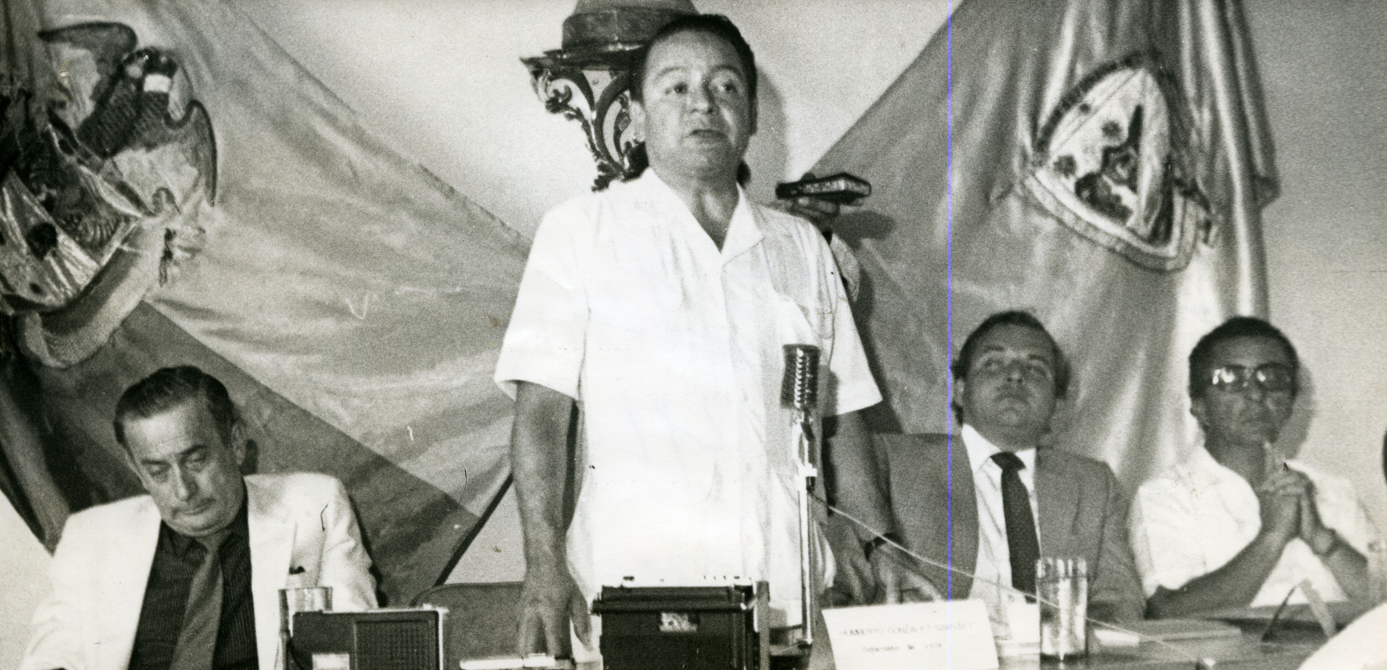 FotografÍa de plano medio largo de Humberto González Narváez, donde se observa de pie frente a un microfono, al lado derecho se encuentra un hobre y al lado izquierdo se ven dos personas más, detras de él se ven dos escudos pegados a dos banderas que estan en la pared