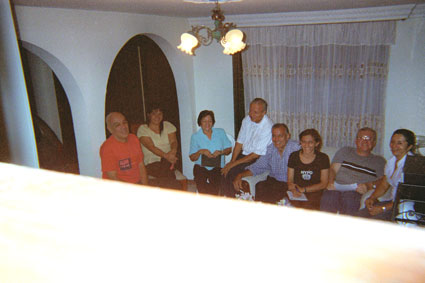Plano medio. Imagen tomada con flash, en escasas condiciones de luz. Se aprecia un grupo de personas compartiendo en una sala, mirando hacia la cámara. En el extremo inferior un plano muy iluminado por la luz del flash. En la parte superior dos focos luminosos.