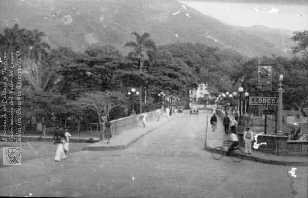 Así se veía el Puente Ortiz, al fondo la antigua casa del señor Emiliano Otero, hoy día encontramos el Palacio Rosado. Cali. C. 1945.