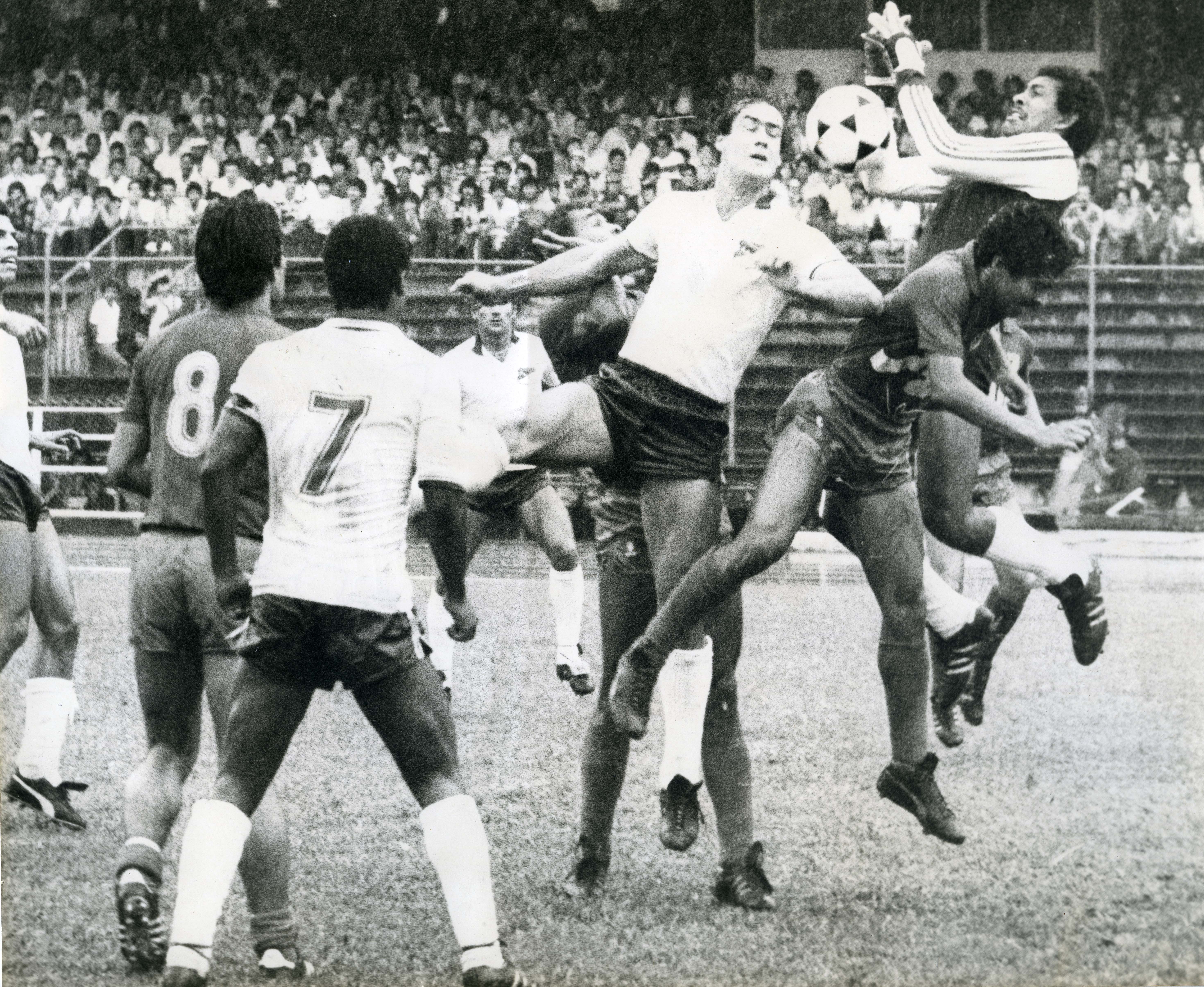 En el pie de foto dice lo siguiente: Luis Octavio Gómez, gran figura del partido, domina el balón ante el asedio de los delantero "verdiblancos". Cali dejó escapar dos valiosos puntos.