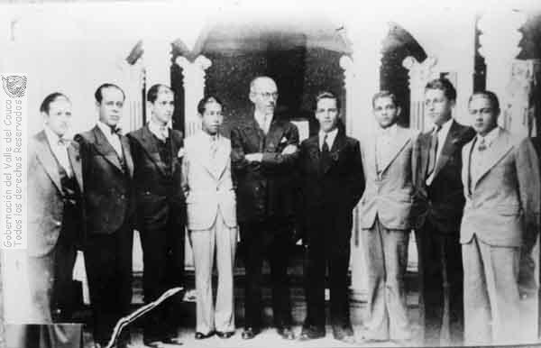 Grupo de Profesores del Colegio General Santander de Sevilla en 1935. Luís Puerta, José Dolores Muñoz, Ernesto Herrera, Hernando Correa, José María Velazco Ibarra (Rector), Raúl Arias, José Cardona Hoyos, Florentino Muñoz, Carlos González.