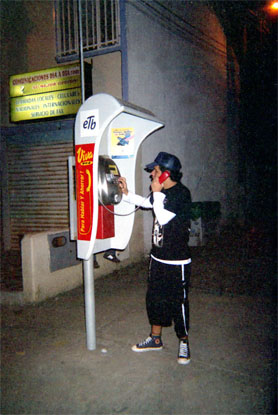 Plano medio. Sujeto en cabina telefónica. Toma lateral de personaje central. Detalle de pies que sobresalen bajo cabina telefónica, otorga comicidad a la escena. Foco en costado superior derecho.
