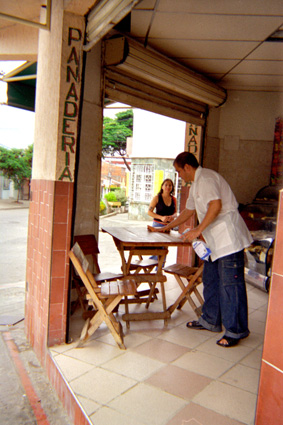 Plano medio de interior a exteriores. Dentro de la panadería podemos ver cómo es limpiada la superficie de madera de una de las mesas. Fotograía vertical; cromáticamente armoniosa por los colores de las baldosas , el enchapado y el cielo raso .