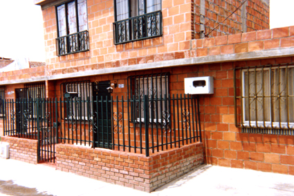 Primer plano de casa. Exterior día. Realce de verja en antejardín. Textura en relieves. Ladrillo a la vista. Acera con presencia de agua.