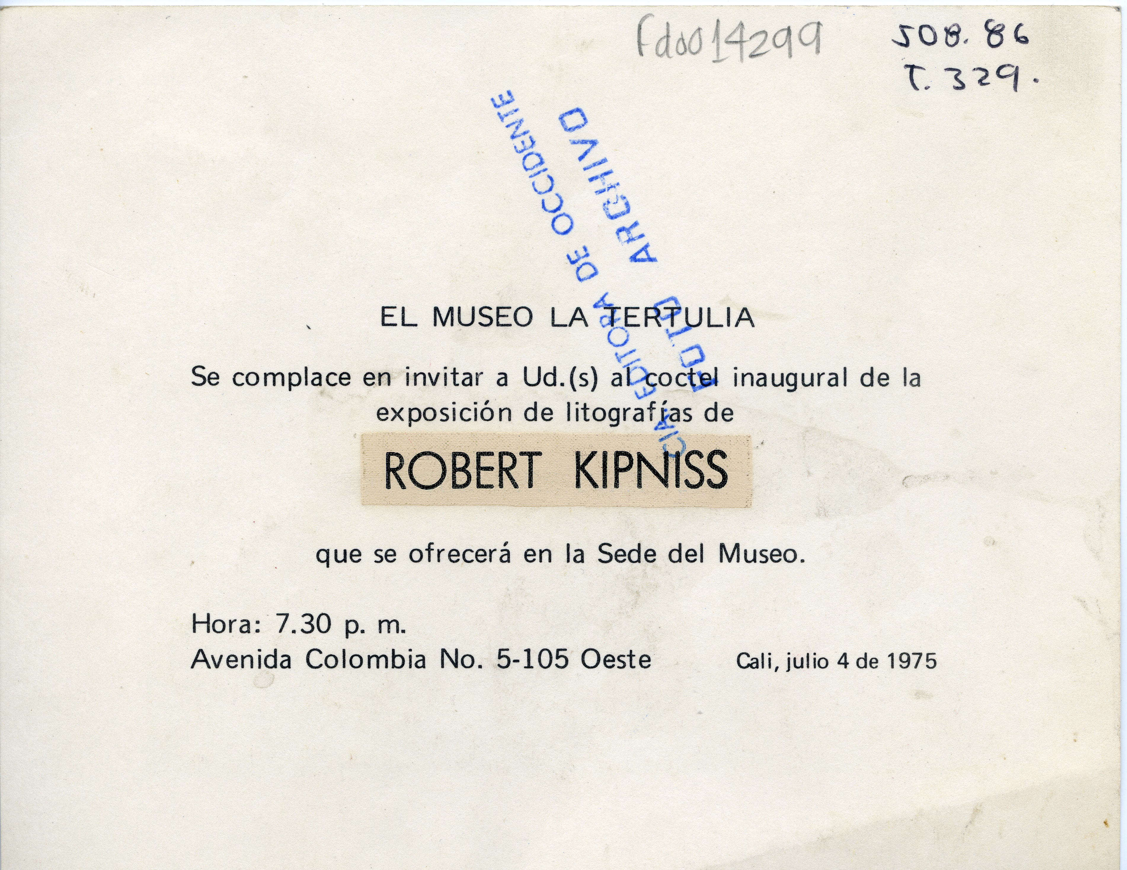 | dc.description.abstract | Invitación a un cóctel inaugural de la exposición de litografías de Robert Kipniss en la sede del museo. | spa |