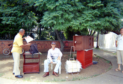 dc.description | Sujetos en primer plano. Exterior día. Venta ambulante de muebles. Vegetación en franja superior. Hombre de perfil en costado izquierdo. Expresiones alegres de hombre sentado y mujer. | spa |