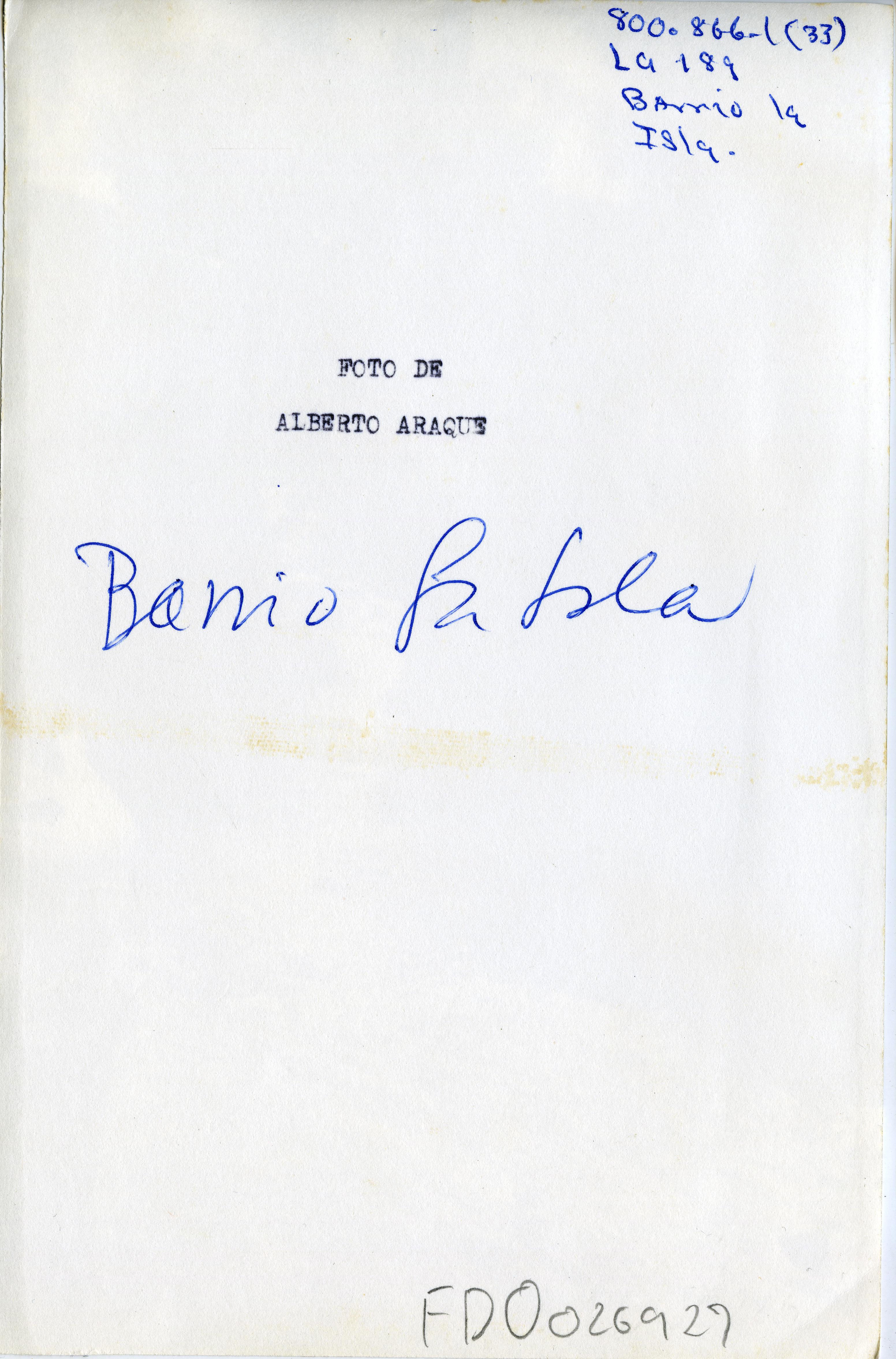 En la gráfica se observa un espacio del barrio "La Isla". Se observa la fachada de una cas, unos niños sentados en la puerta, en primer plano a la derecha una mujer. Se observa un camino de tierra y la naturaleza a su alrededor. También hay postes de alumbrado público y cableado de energía.