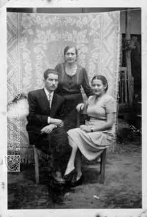 Julia Bejarano, Hector Bejarano y Mariela Alzate de Bejarano, en el patio de la casa platicando. Bugalagrande. C. 1948.
