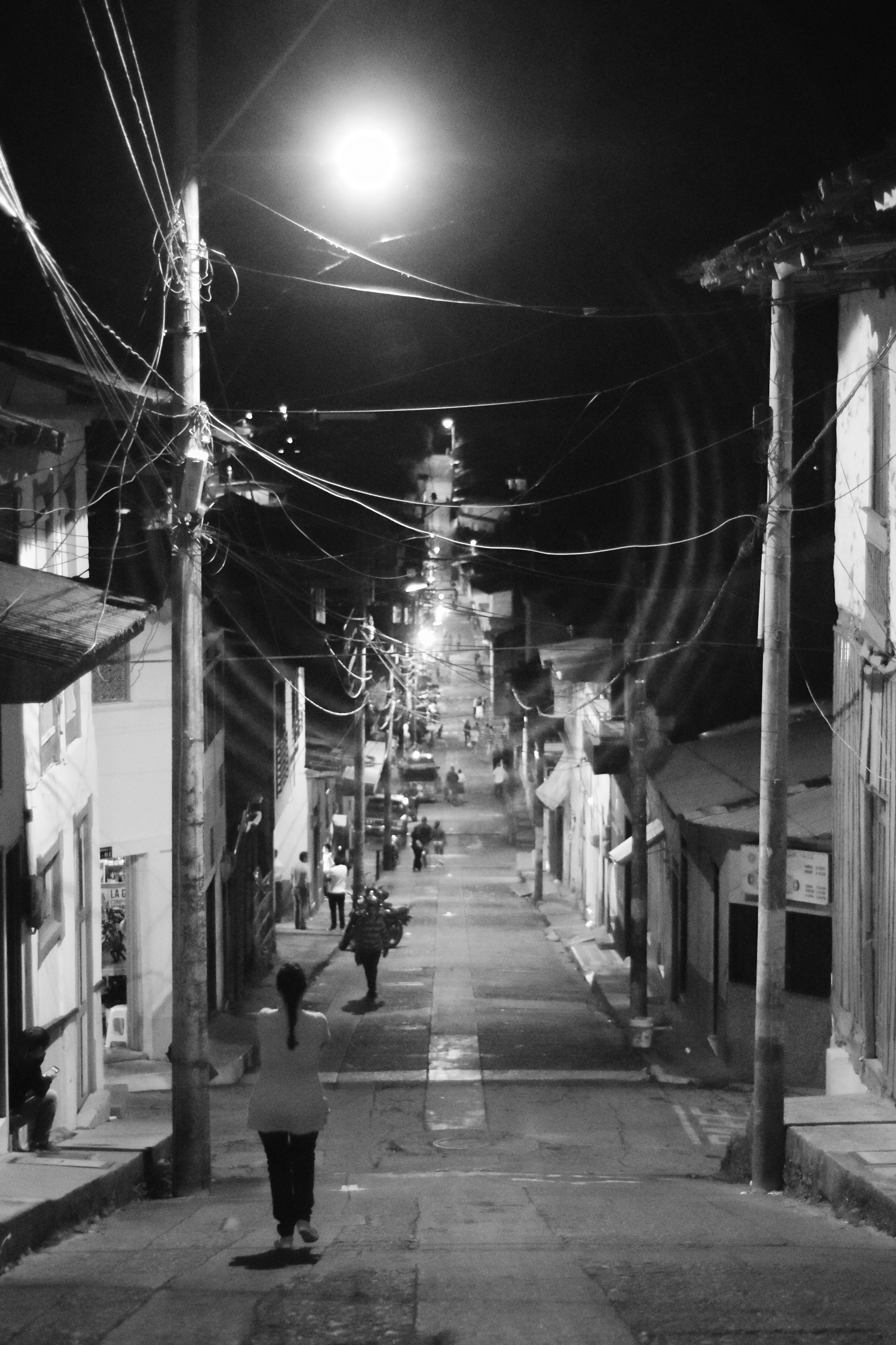 El Águila, Valle del Cauca. Fundado en 1899, por Emelecio Duque, Marcelino Echeverri y los hermanos Bernardo y Natalio Serna. Municipio desde 1950. Economía importante en agricultura, caficultura, ganadería, minería, explotación forestal, etc. Observamos en la imagen, calle principal de noche. Se aprecia la luna, viviendas y la gente