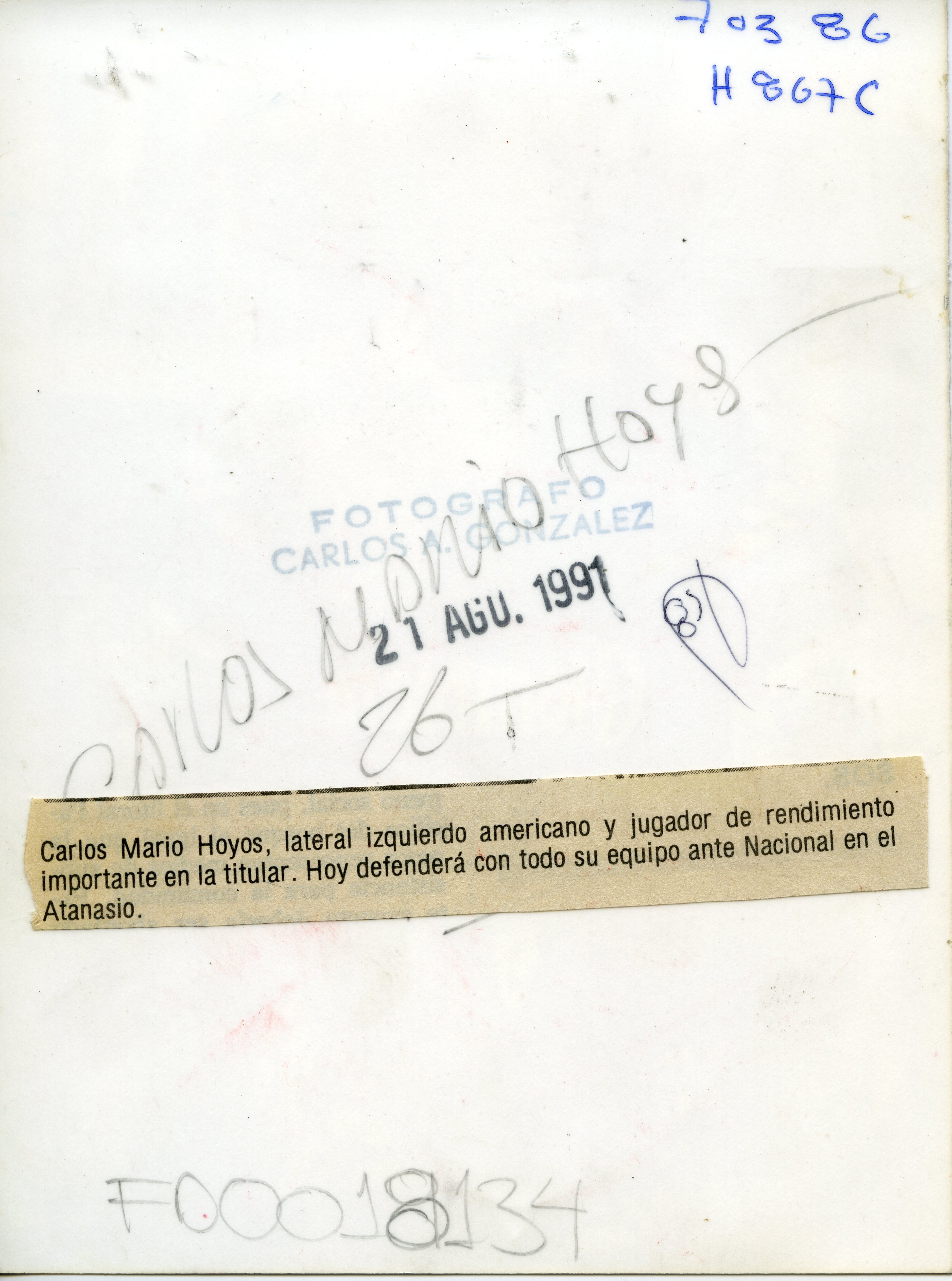 Plano medio largo de Carlos Mario Hoyos, atrás se divisa graderías. Al reverso de la fotografía se anexa recorte: "Carlos Mario Hoyos, lateral izquierdo americano y jugador de rendimiento importante en la titular. Hoy defenderá con todo su equipo ante Nacional en el Atanasio,"