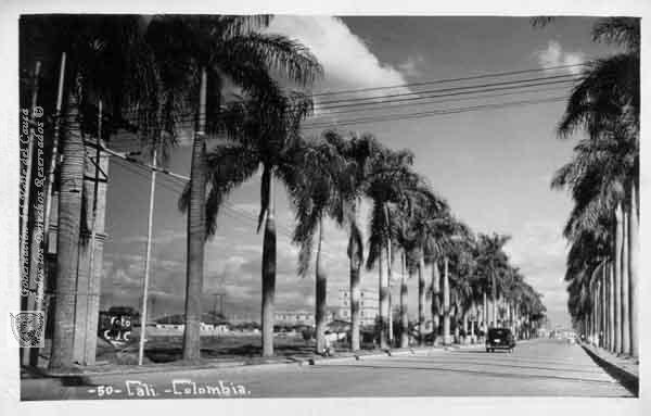 Calle 25. Avenida de palmeras sanconas, de las que vemos aquí pocas quedan en pie, fueron sembradas para imprimirle una imagen de orden y organización al espacio urbano. Santiago de Cali, fecha aproximada, 1942.