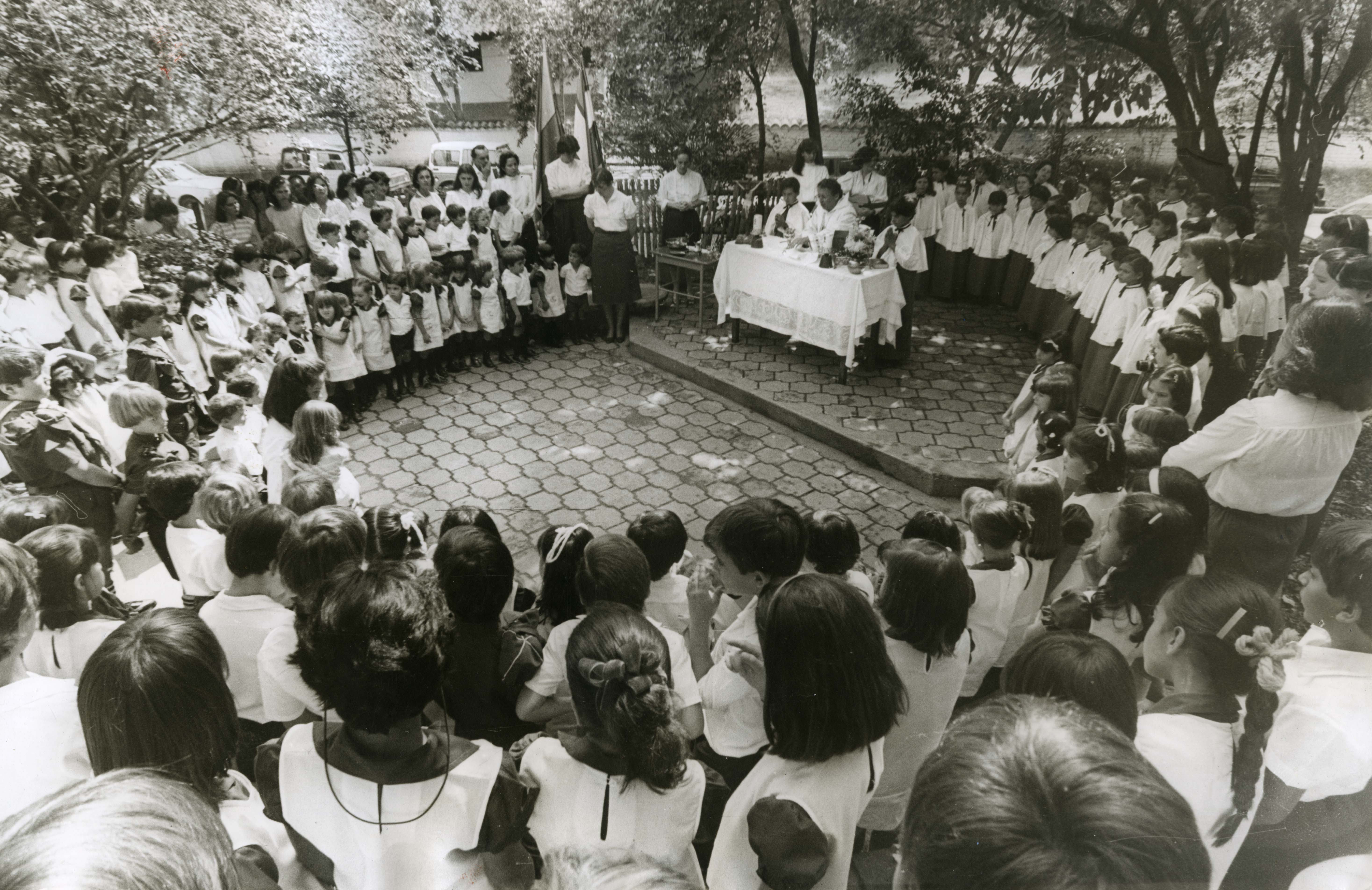 En el pie de foto dice lo siguiente: Durante la celebración de la misa oficiada por el sacerdote Javier Bernal, para conmemorar los diez años del Ginmasio La Colina y en memoria de la fundadora del prestigioso plantel educativo, la señora Rosario Casas de Iragorri, los niños, profesores, directivas y padres de familia, siguen atentos el desarrollo de la Eucaristía.- El Archivo del Patrimonio Fotográfico y Fílmico del Valle del Cauca es responsabilidad de la Biblioteca Departamental del Valle Jorge Garcés Borrero, por convenio de cooperación suscrito con la Secretaria del Cultura Departamental, con el fin de aunar esfuerzos para su conservación, preservación y divulgación del Archivo entre la comunidad Vallecaucana, especialmente entre los estudiantes e investigadores que visitan la Biblioteca, propiciando el su uso y consulta permanente. La universidad Icesi es un colaborador en el proceso de difusión, facilitando la tecnología que permite la consulta de las imágenes.