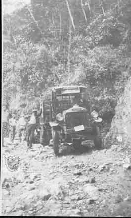 Primera excursión en camiones Brockway de Cali a Manizales. Caminos destapados y bastantes difíciles de transitar. 1926.