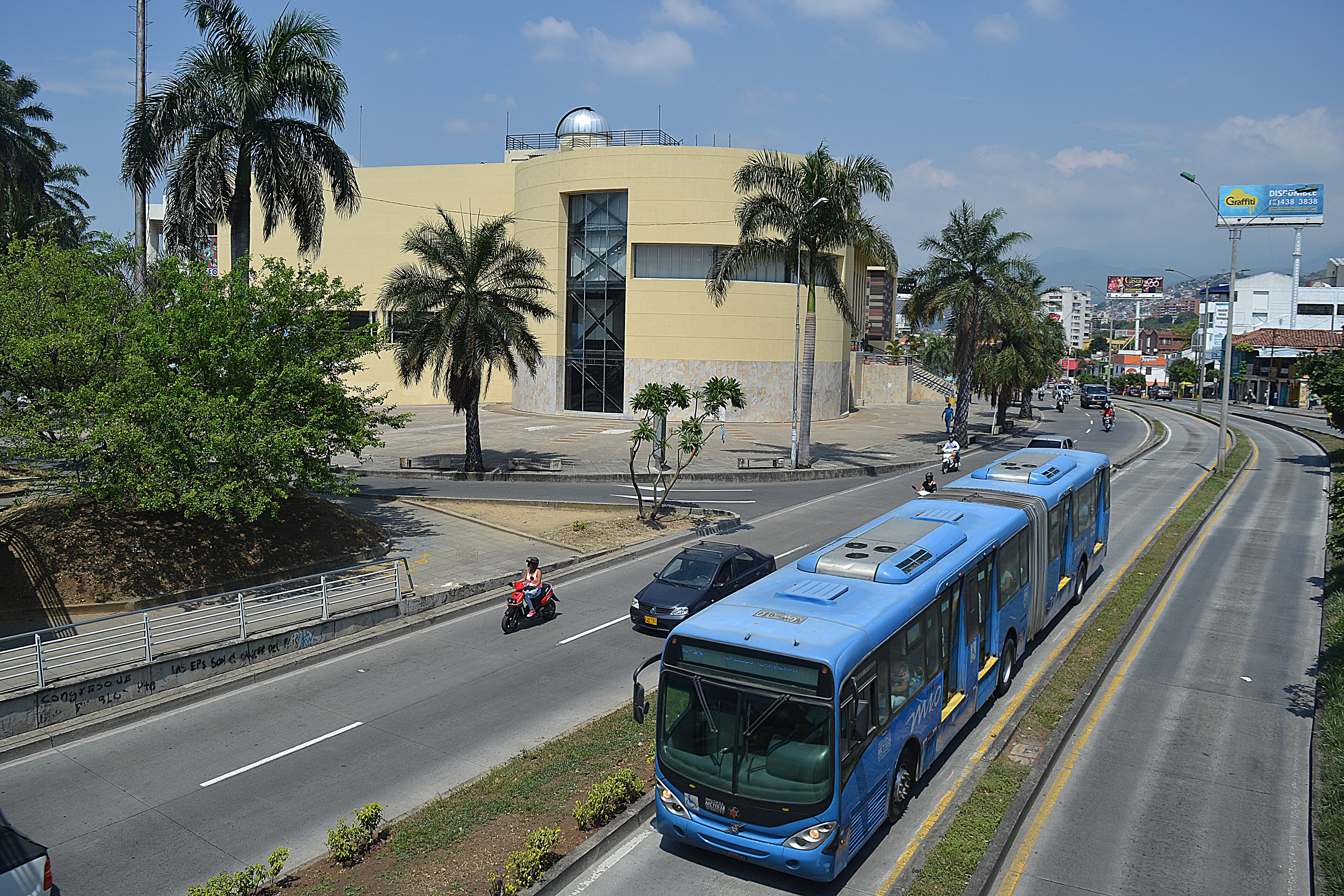Se aprecia al fondo Biblioteca Departamental Jorge Garcés Borrero, en registro fotográfico se evidencia un bus articulado del MIO en sentido sur norte.