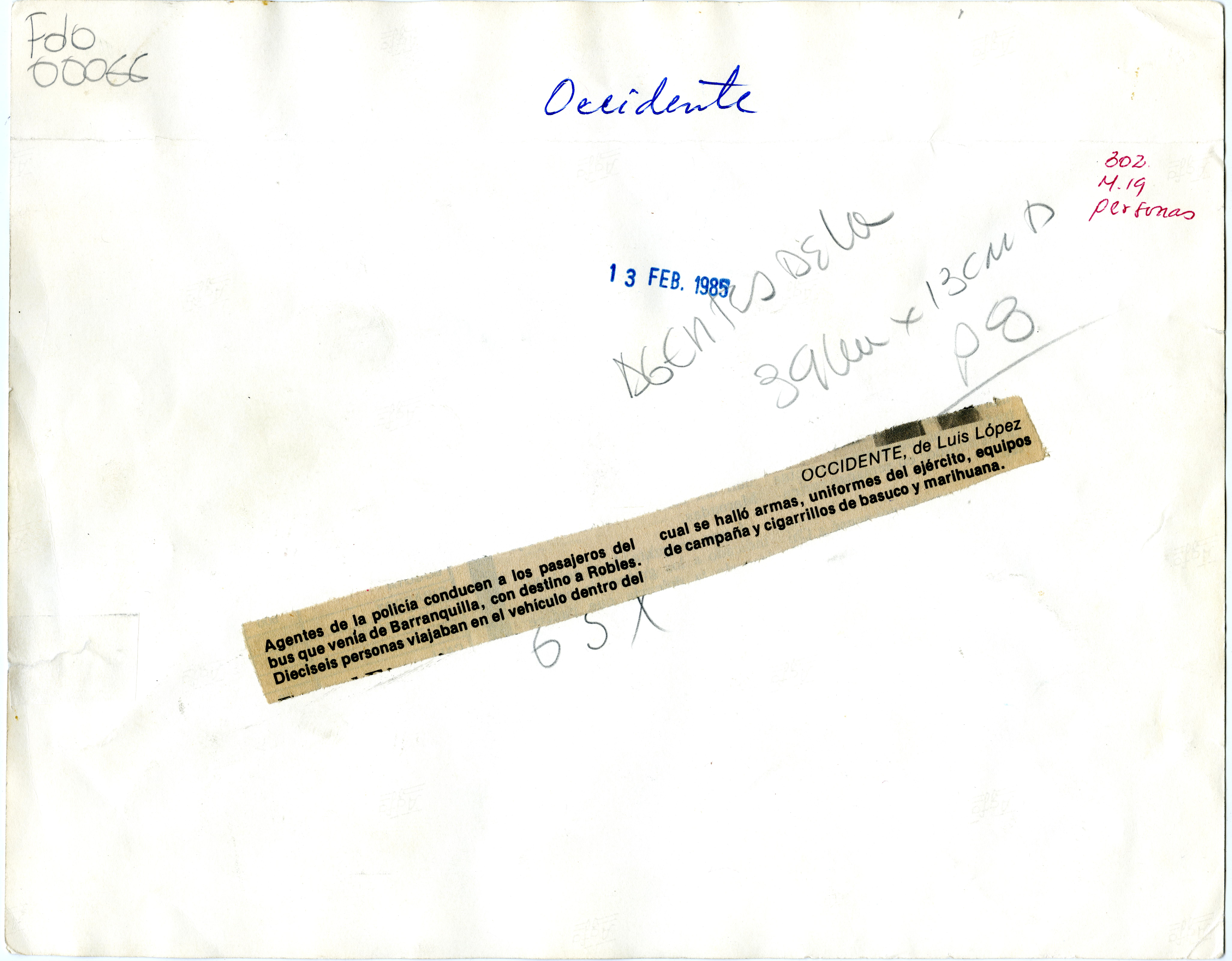López, L. & Diario Occidente (1985). Personas que viajaban en un bus en el cual se halló armas y uniformes del ejército. Santiago de Cali: Biblioteca Departamental Jorge Garcés Borrero.