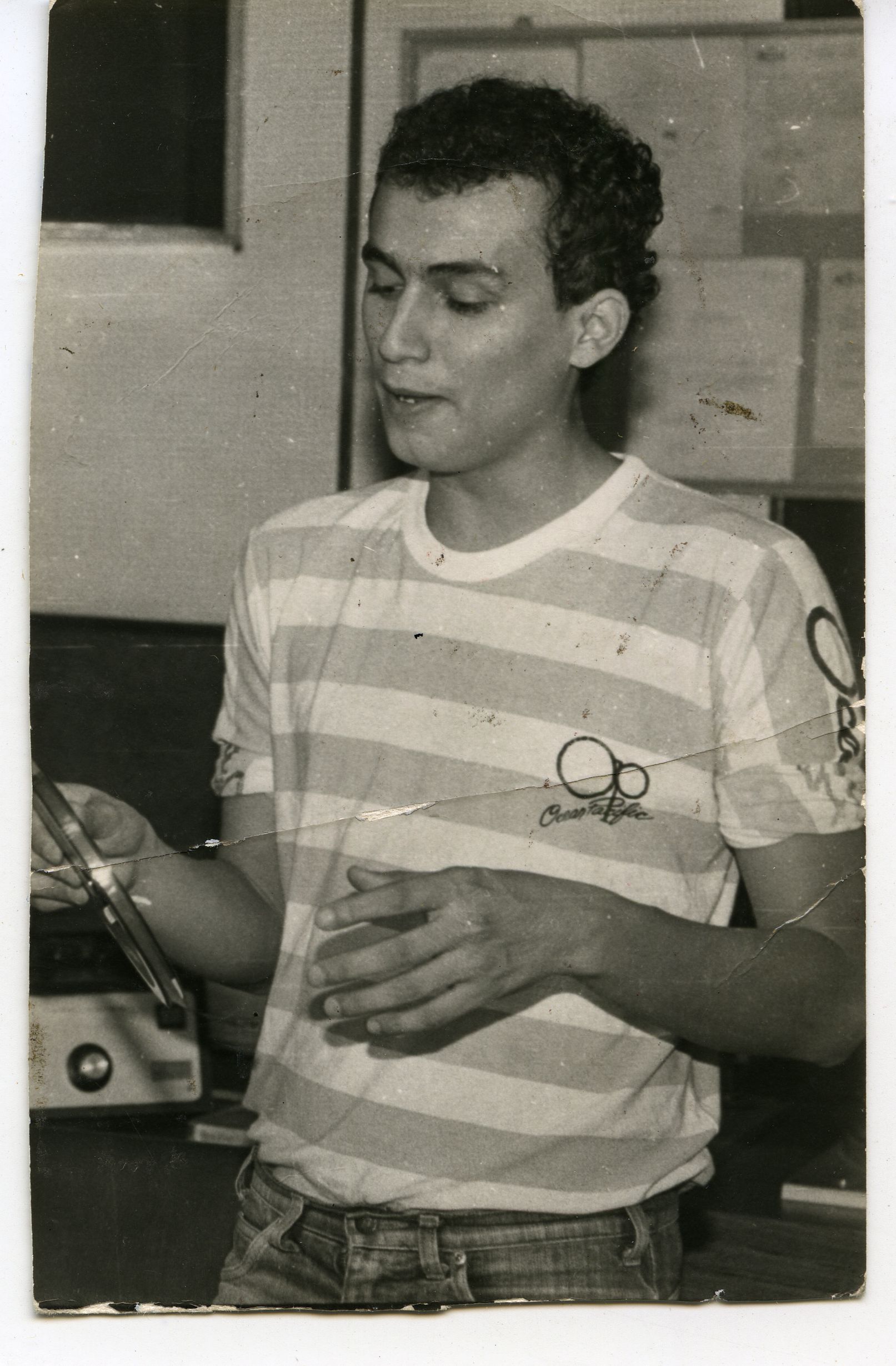 Retrato de Luis Cesar, mientras sostiene una cinta filmografía.