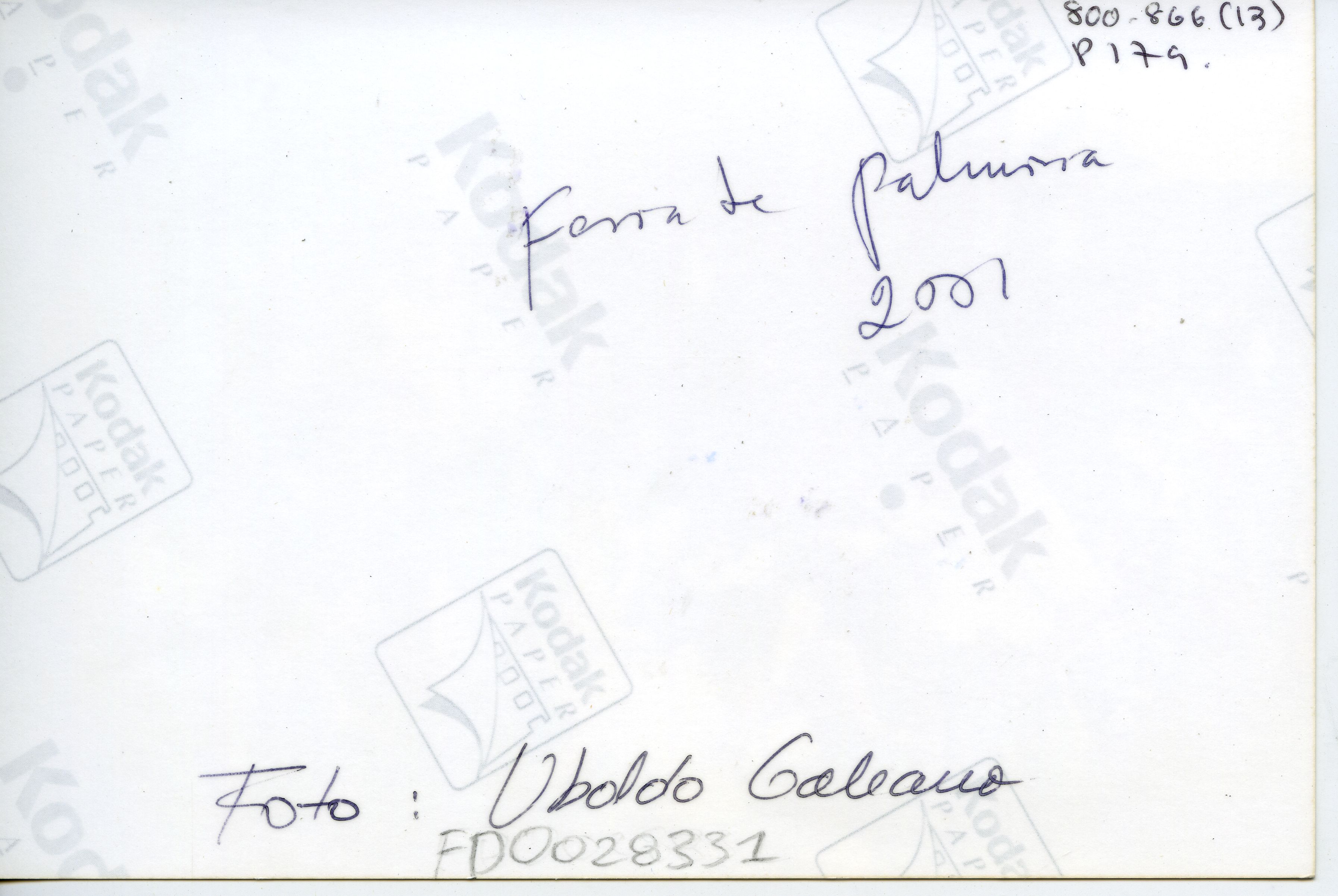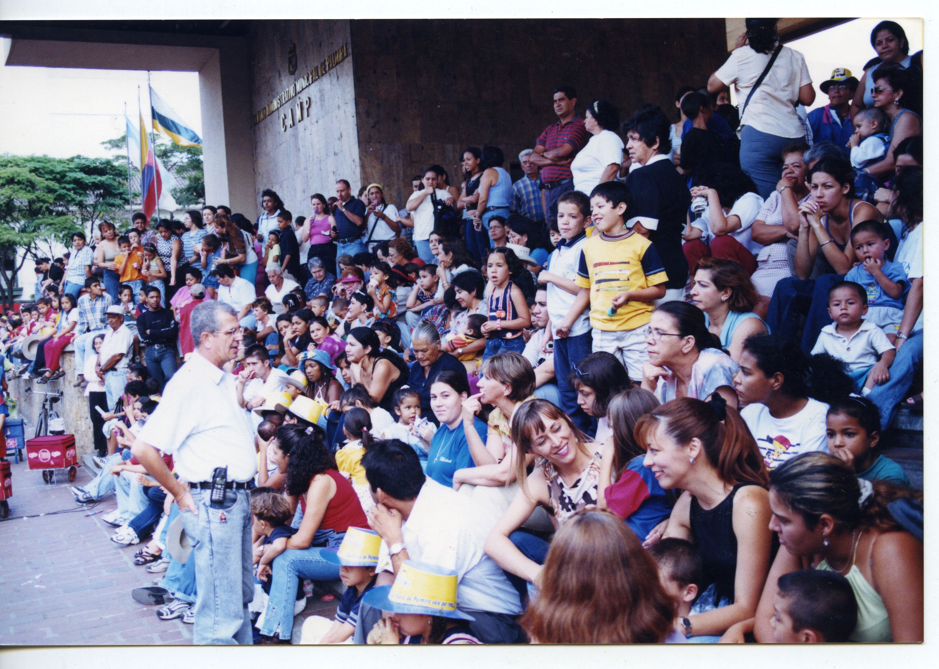LA fotografía retrata a un grupo de personas reunidas frente a las instalaciones del Centro Administrativo Municipal de Palmira CAMP. en el marco de la feria de Palmira del año 2001.