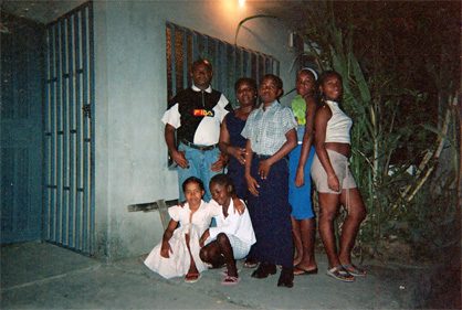 Plano medio. Imagen tomada en exterior, donde se puede apreciar un grupo de personas posando para la cámara. Al fondo la fachada de una vivienda. Toma realizada con luz de flash.