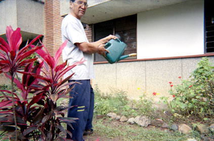 Primer plano de planta en inferior izquierdo. Exterior día. Retrato de hombre con regadera en antejardín. Realce de formas geométricas de fondo.
