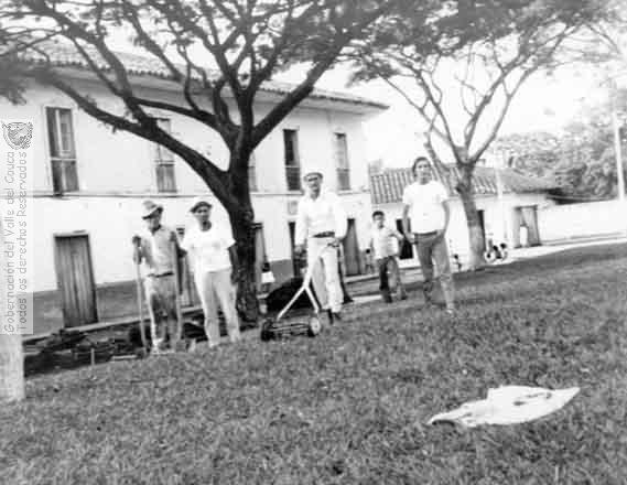 JAIME VELASQUEZ (1900). Grupo de empleados del municipio haciendo trabajos de mantenimiento en el parque Estación & 600808. CARTAGO: Biblioteca Departamental Jorge Garces Borrero.