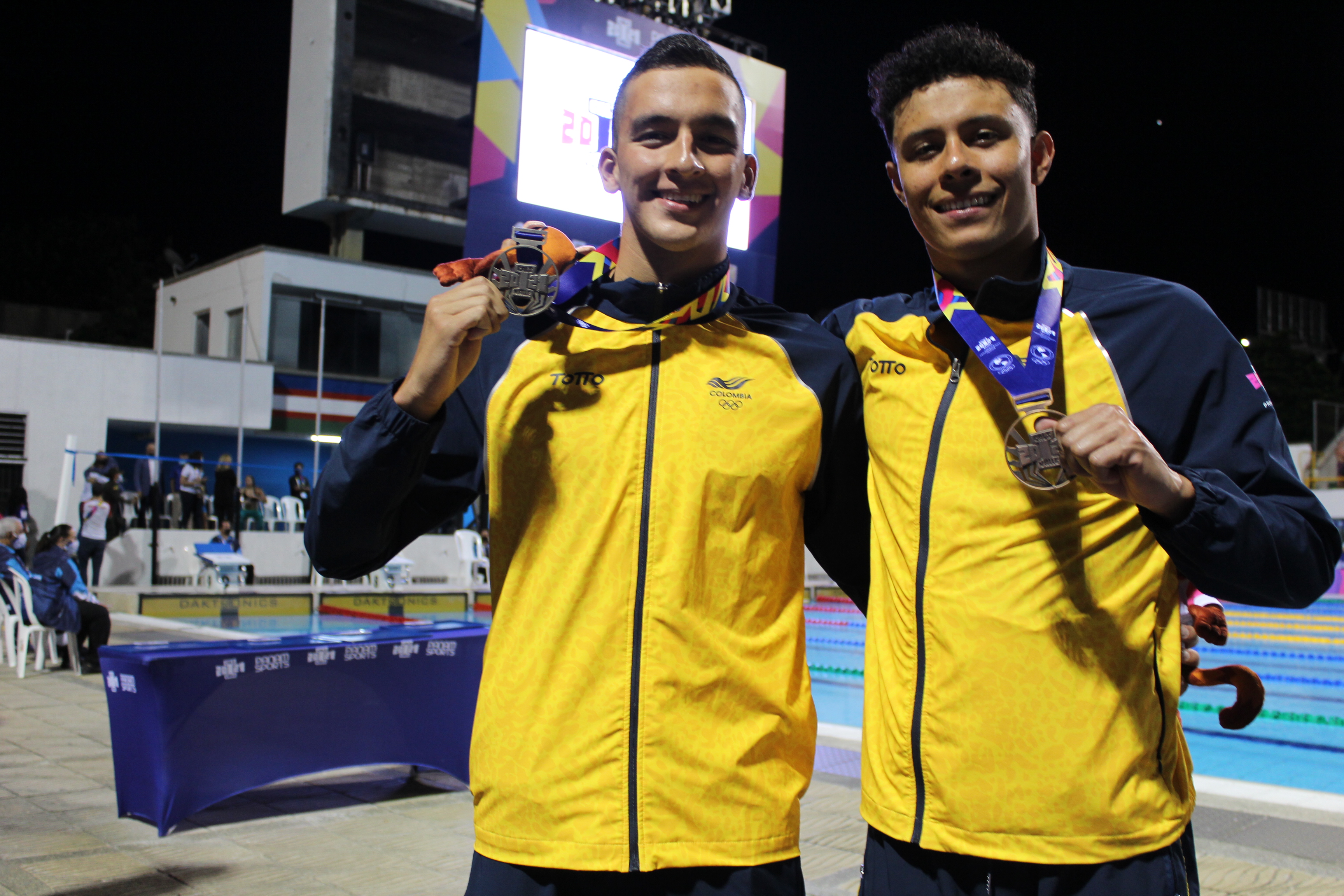 En la fotografía podemos observar a los deportistas Juan Manuel Morales Restrepo y Santiago Angel Corredor Zabala participantes y ganadores en la modalidad natación en los "I Juegos Panamericanos Junior", llevados a cabo en la ciudad de Cali.