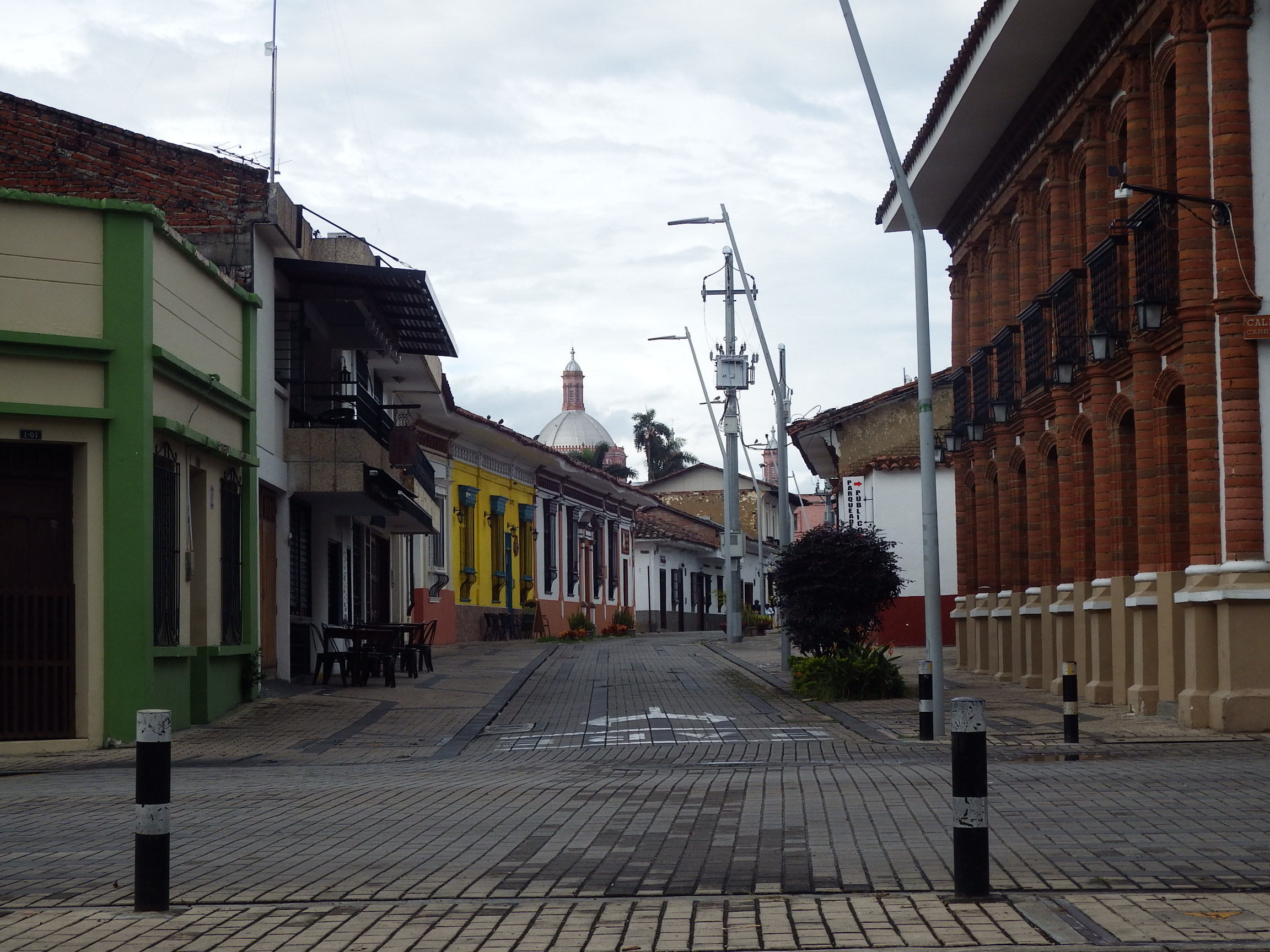 Registro fotográfico de una de las calles del municipio de Buga, se evidencia casa coloniales al fondo se aprecia la Basilica del señor de los milagros