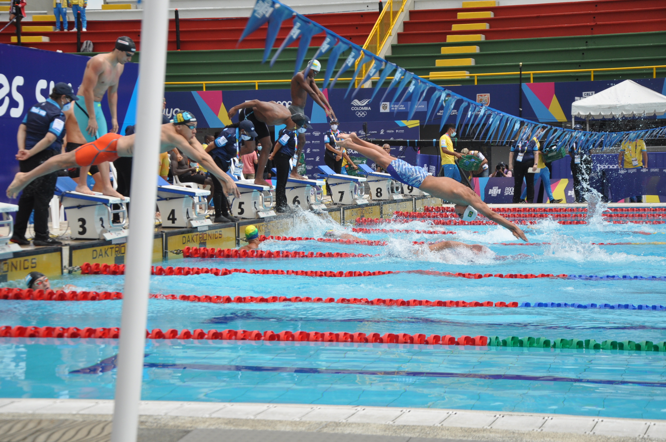 En el registro fotográfico podemos observar a los deportistas compitiendo en la prueba de natación en los "I Juegos Panamericanos Junior", llevados a cabo en la ciudad de Cali.