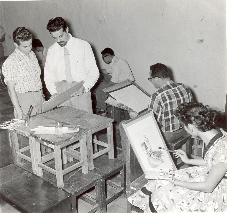 Prof. Mario Alessandro Gurisati con sus estudiantes en clase de pintura. Instituto Departamental de Bellas Artes, incialmente se ubicó en la calle 4ª con calle 6. Santiago de Cali, 1957.