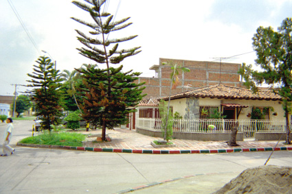 Plano General. Se aprecia la fachada de una vivienda en una esquina, con varios árboles en su entorno. En el extremo inferior una vía pavimentada. Al fondo un muro en ladrillo se levanta detrás de la casa.