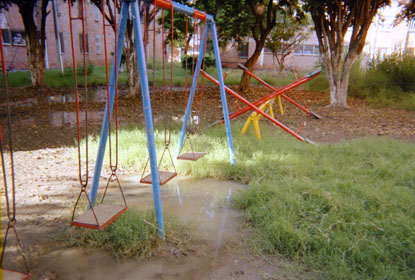 Primer plano de juegos infantiles. Conjunto de edificios de fondo. Realce de luz y sombra sobre prado.