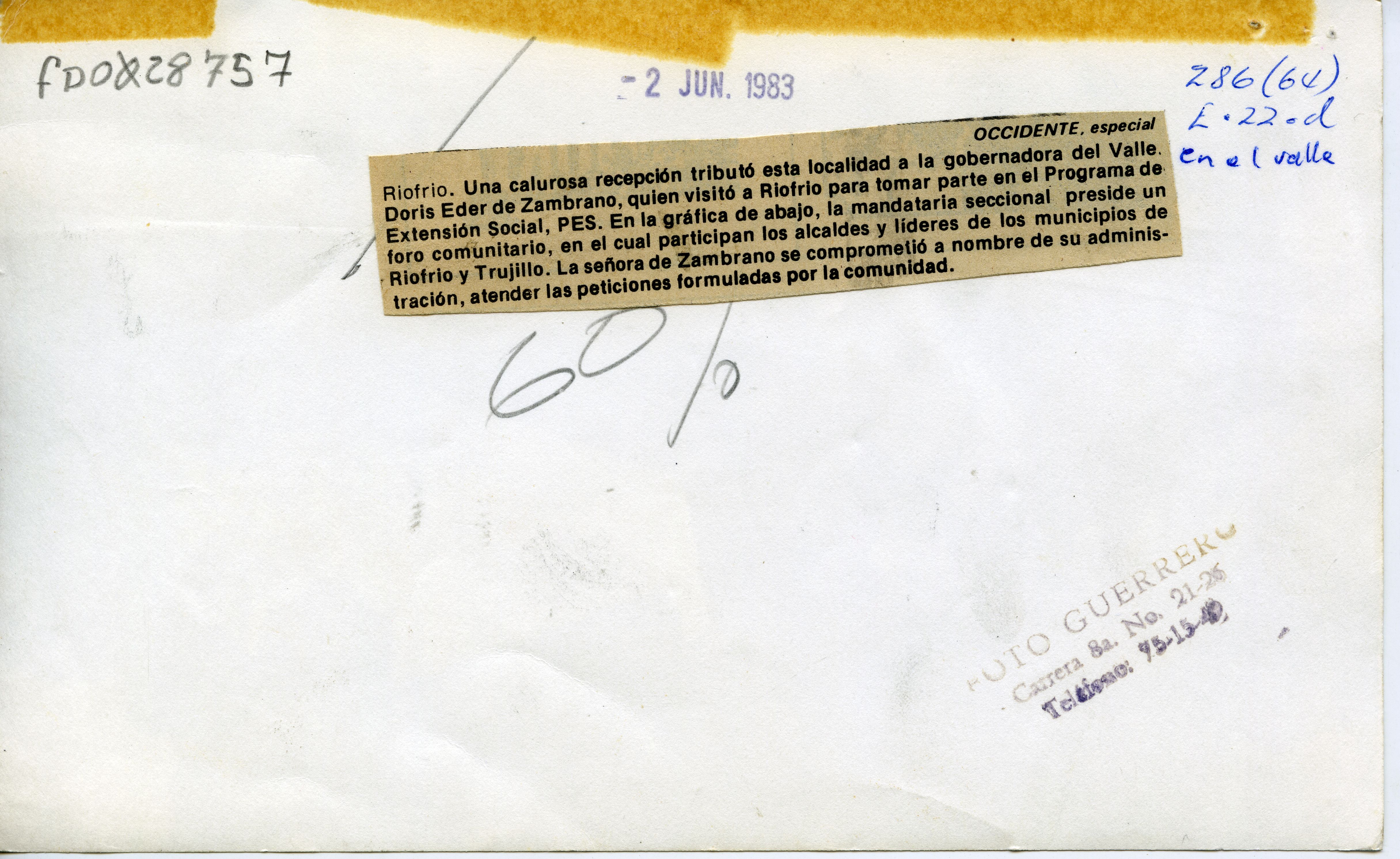| dc.description.abstract | "Reverso: Riofrio. Una calurosa recepción tributó esta localidad a la gobernadora del Valle, Doris Eder de Zambrano, quien visitó a Riofrio para tomar parte en el Programa de Extensión Social, PES. En la gráfica de abajo, la mandataria seccional preside un foro comunitario, en el cual participan los alcaldes y líderes de los municipios de Riofrio y Trujillo. La señora de Zambrano se comprometió a nombre de su administración, atender las peticiones formuladas por la comunidad." | spa |