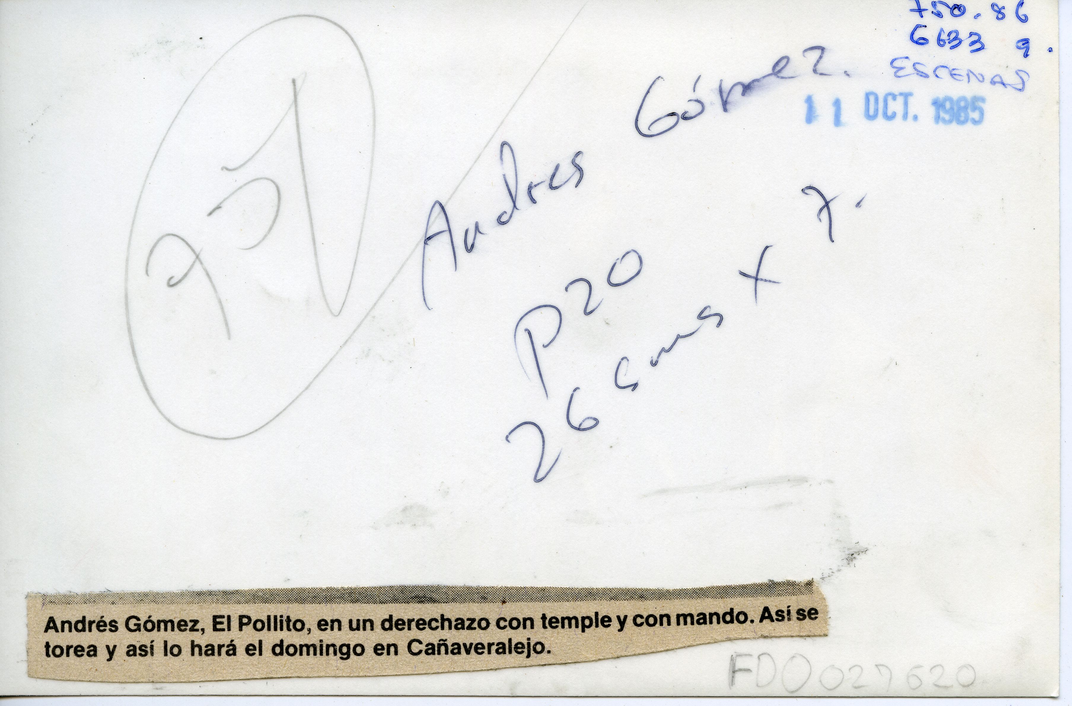 se observa en la foto a Andrés Alberto Kuri Gómez "el palmeño" o "el pollito" en honor a su tío Rafael "el pollo" Gómez. en cuando una faena del palmeño bajo la atenta mirada de un publico de fondo.
