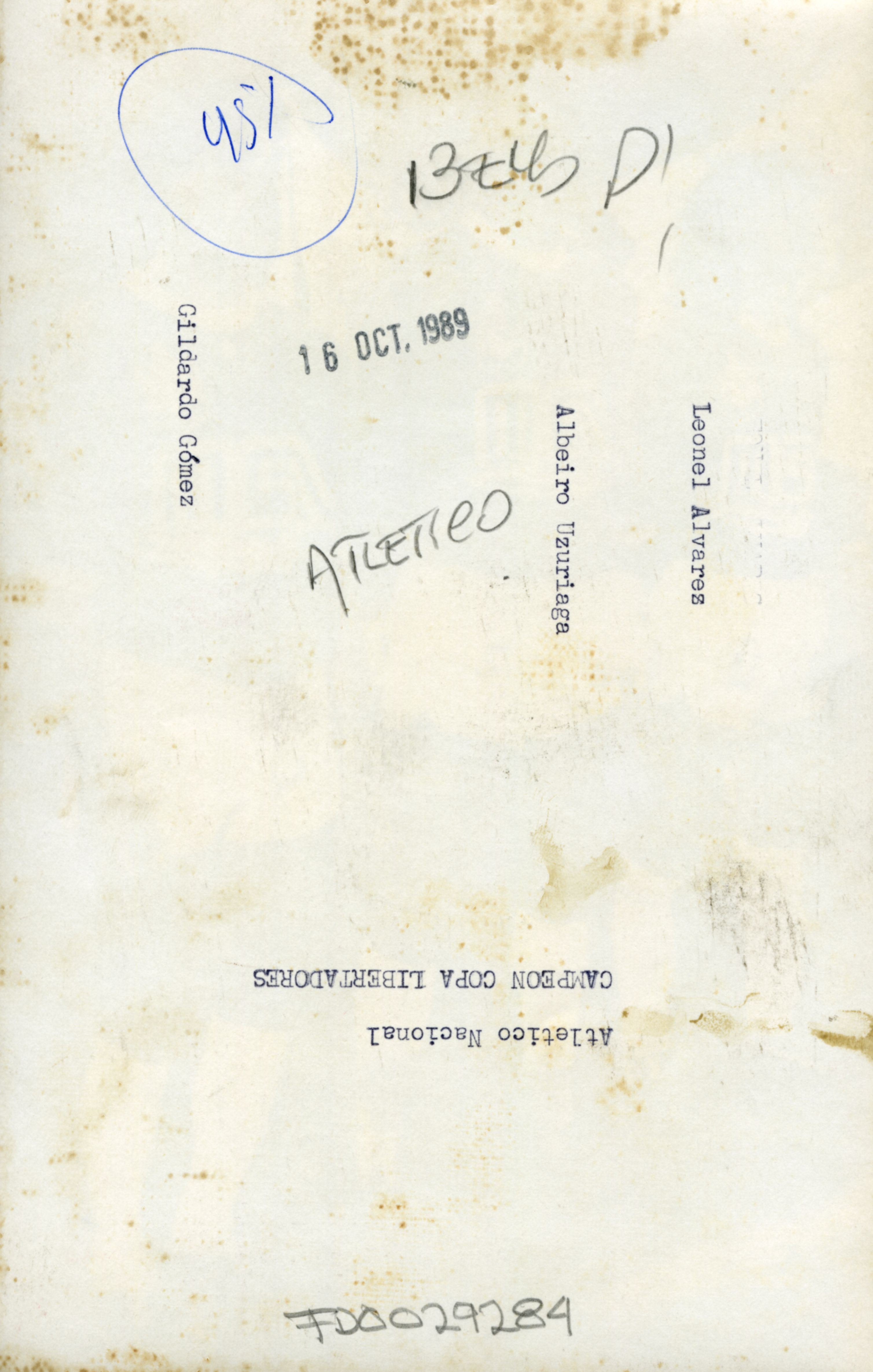 "Leonel de Jesús Álvarez Zuleta Nació en Remedios, Antioquia el 30 de julio de 1965, ""El Tierno"", exfutbolista y entrenador de fútbol. Empezó su carrera en 1983 como futbolista hasta el 2004 y debutó como técnico en mayo del 2009. Albeiro Usuriaga López, 12 de junio de 1966 - Cali, 11 de febrero de 2004, delantero de la gran generación de los años 90, debutó en el América en 1986. Gildardo Gómez, nacido en Remedios, Antioquia el 13 de octubre de 1963, exfutbolista que se desempeñaba como lateral izquierdo. Jugó.con la selección Colombia entre 1987 y 1991, completando 14 partidos. Hizo su debut en el fútbol Colombiano con Medellin en 1984 y se retiró en 1993 jugando con el Atlético Nacional. Jugó en el independiente Medellin, Atlético Nacional y el club Millonarios. En la foto aparecen de izquierda a derecha: Leonel Álvarez, ""El palomo"" Usuriaga y Gildardo Gómez en los actos protocolarios de la final de la copa Libertadores frente a Olimpia."