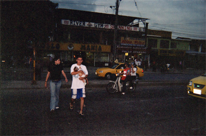 Plano general. Hombre con bebe y mujer cruzando semáforo. Al fondo negocios. Poca iluminación. Exterior noche.