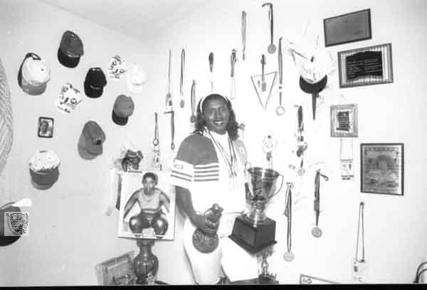 MARÍA ISABEL URRUTIA, pesista nacional y olímpica(2000), en su cuarto con parte de sus trofeos.
